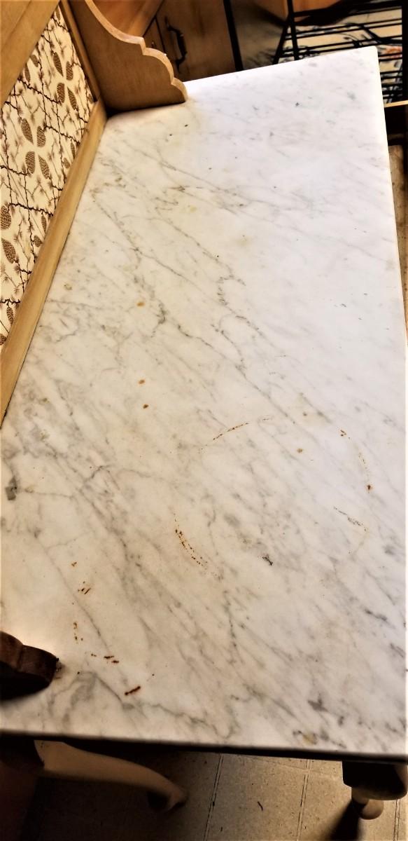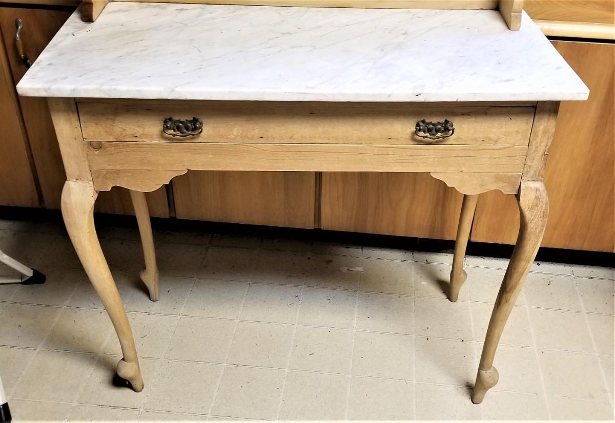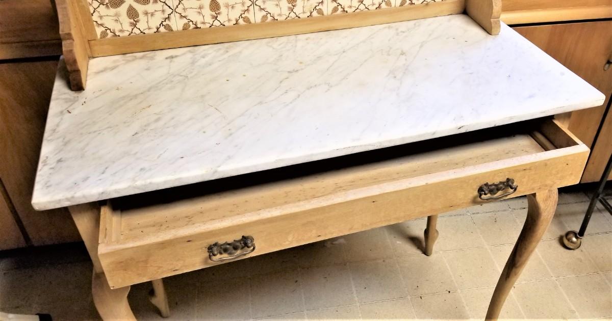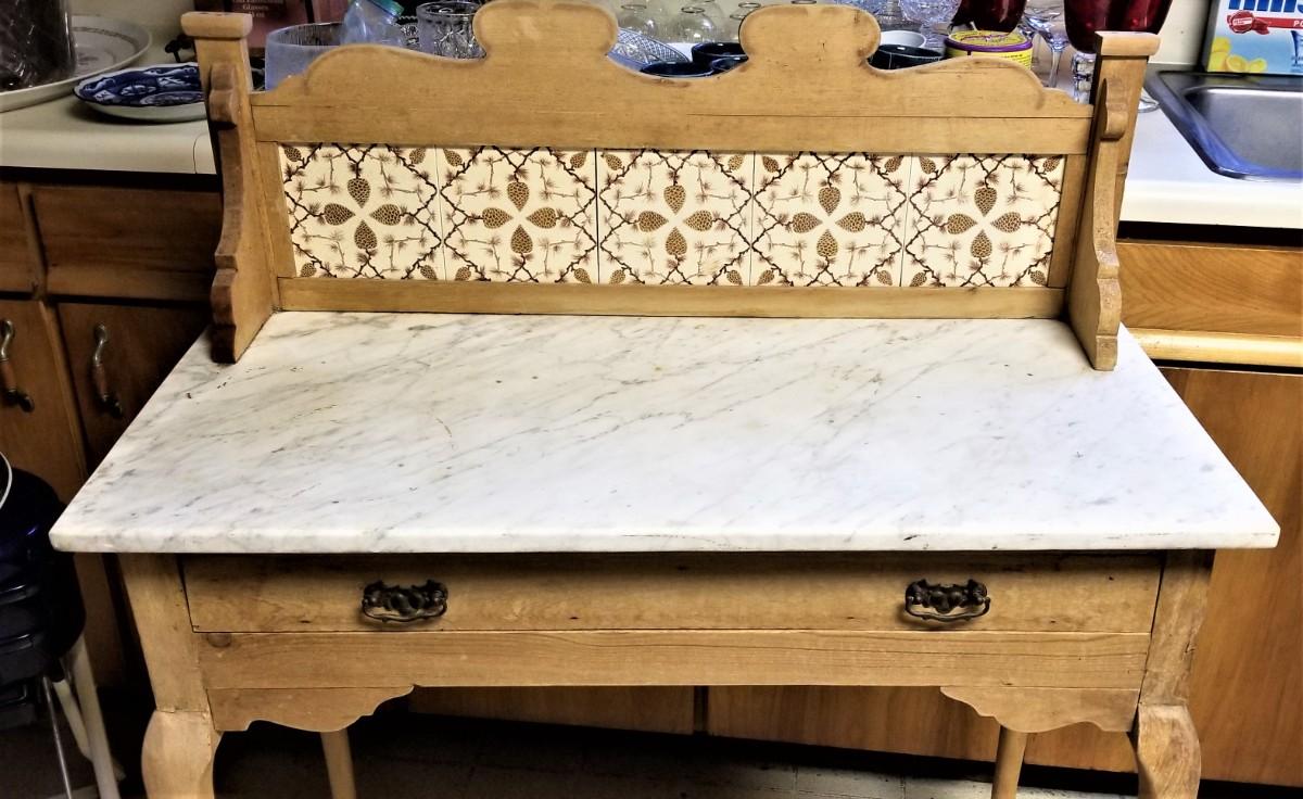 Antique English wash stand or side kitchen table - Aesthetic tile back wash - marble top. Drawer. Antique condition - please view all photos. 3 feet across, 17" deep, 43" tall at tallest point. Pine. A very versatile piece of furniture.