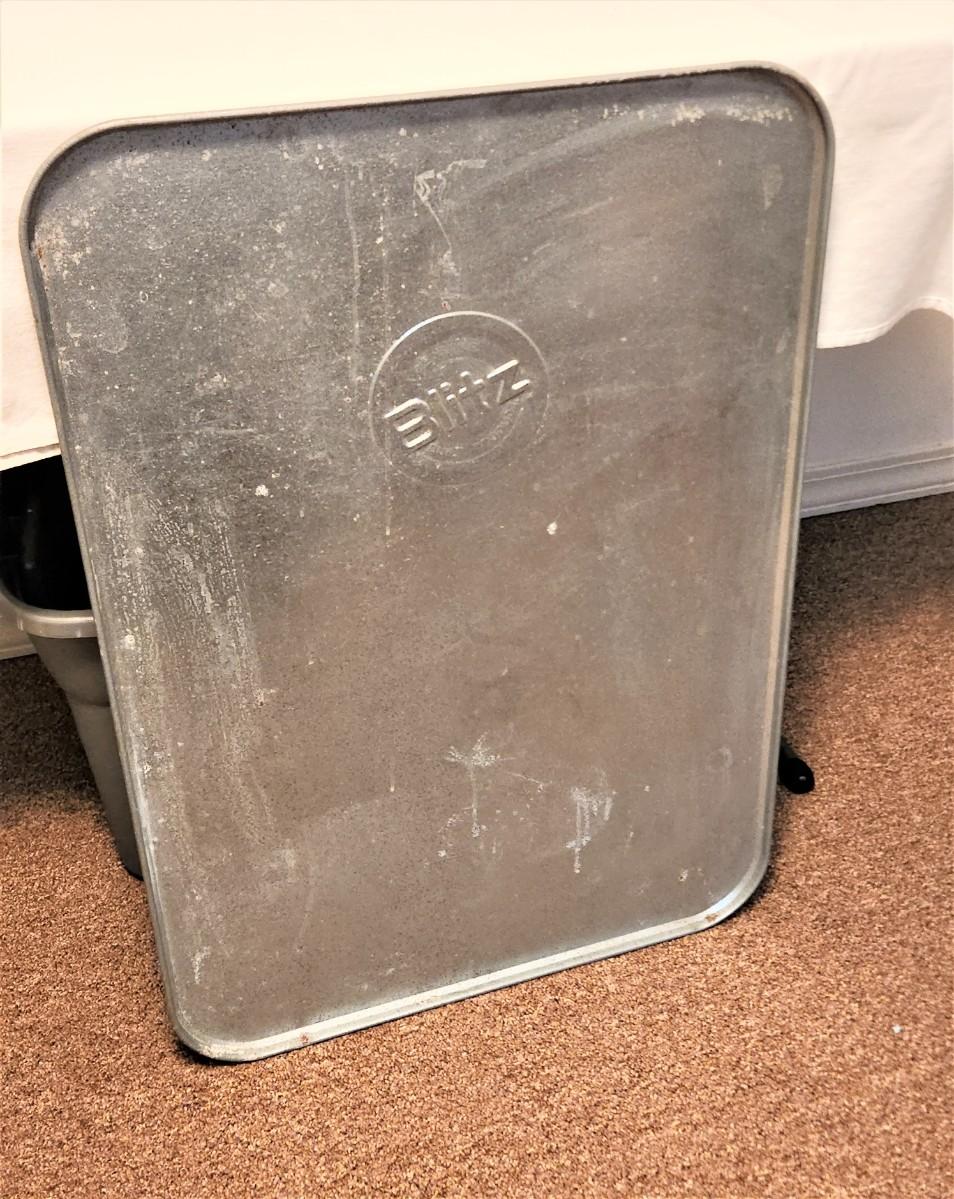 Garage find - vintage BLITZ drip/oil pan - 25" across, 3 feet long.