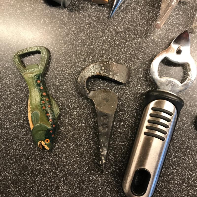 Various bottle openers and bottle stoppers. Includes a iron handmade bottle opener and a fish style opener. Shipping or local pick up in Asheville.