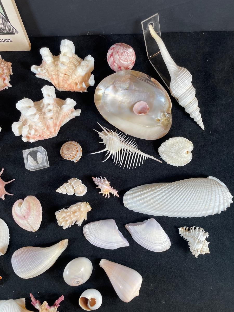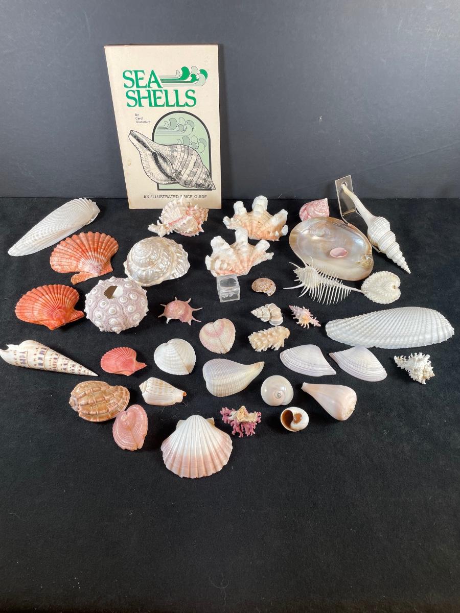 30+ collectible sea shells and a vintage book on shell collecting