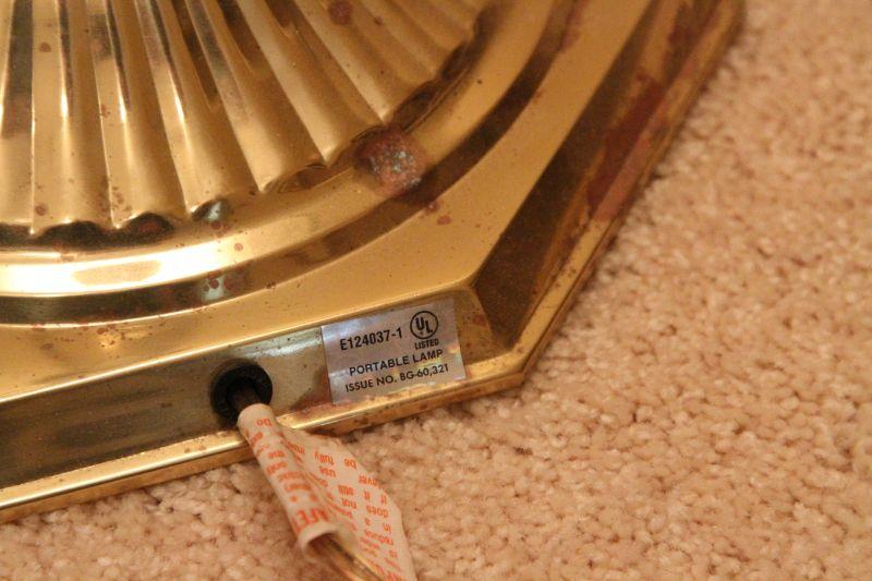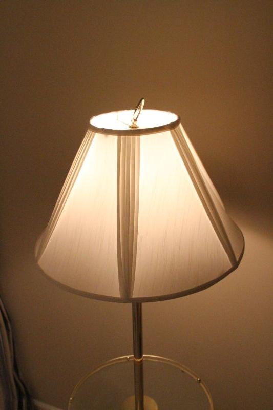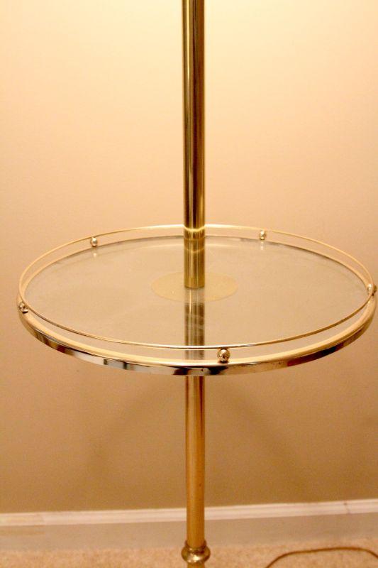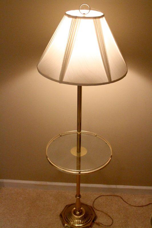Nice 56" high brass base and pole floor lamp with rimmed round glass shelf. Nice fabric shade with pleated accents. No damage to shade. Some food stain on base of lamp.