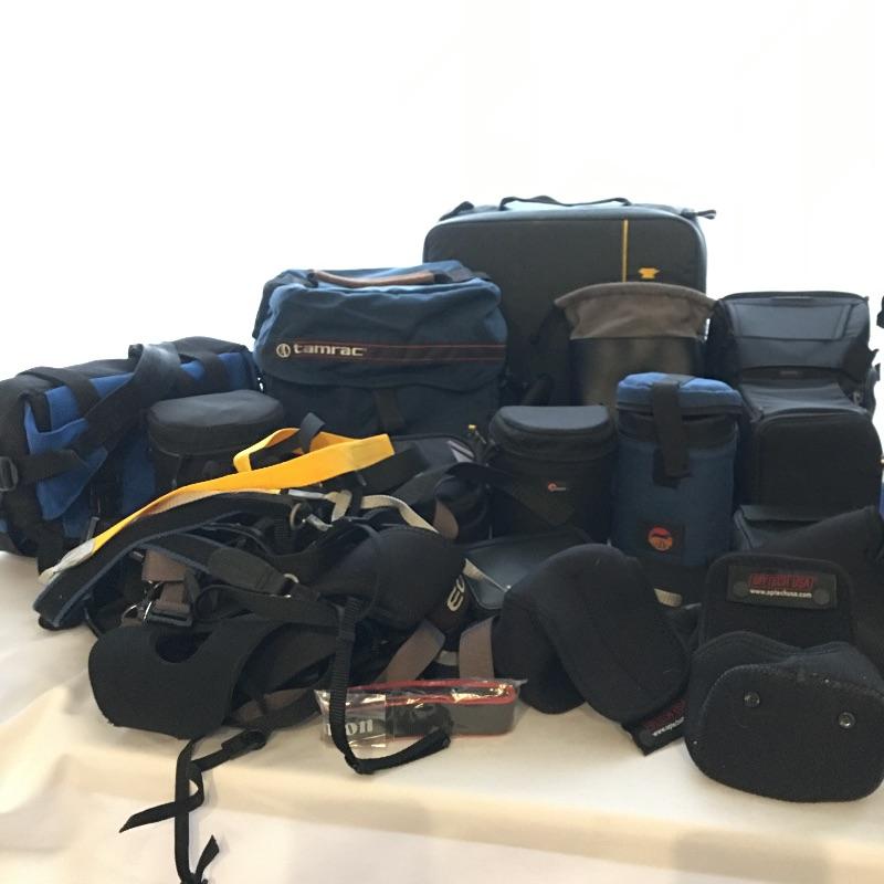 Camera bags and more. Lot includes camera bags, lens bags and camera straps. Brands include Ruggard, Lowepro, Liberty Mountain, Think Tank, Optech, SunKosi and more. Great collection of bags for the camera buff.