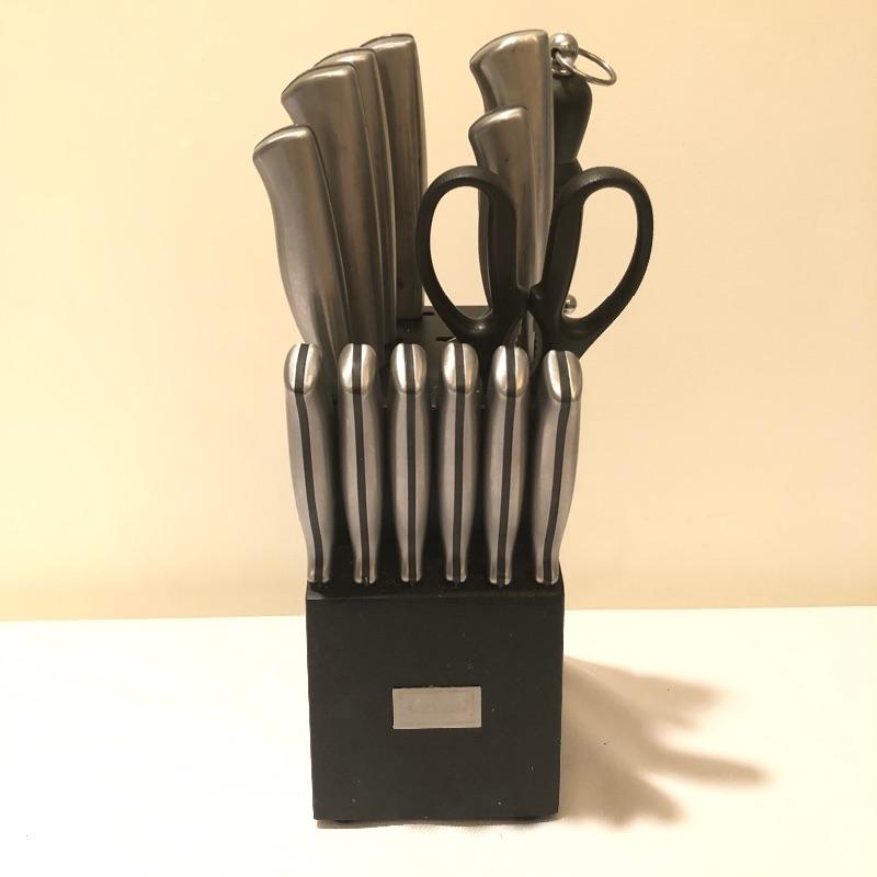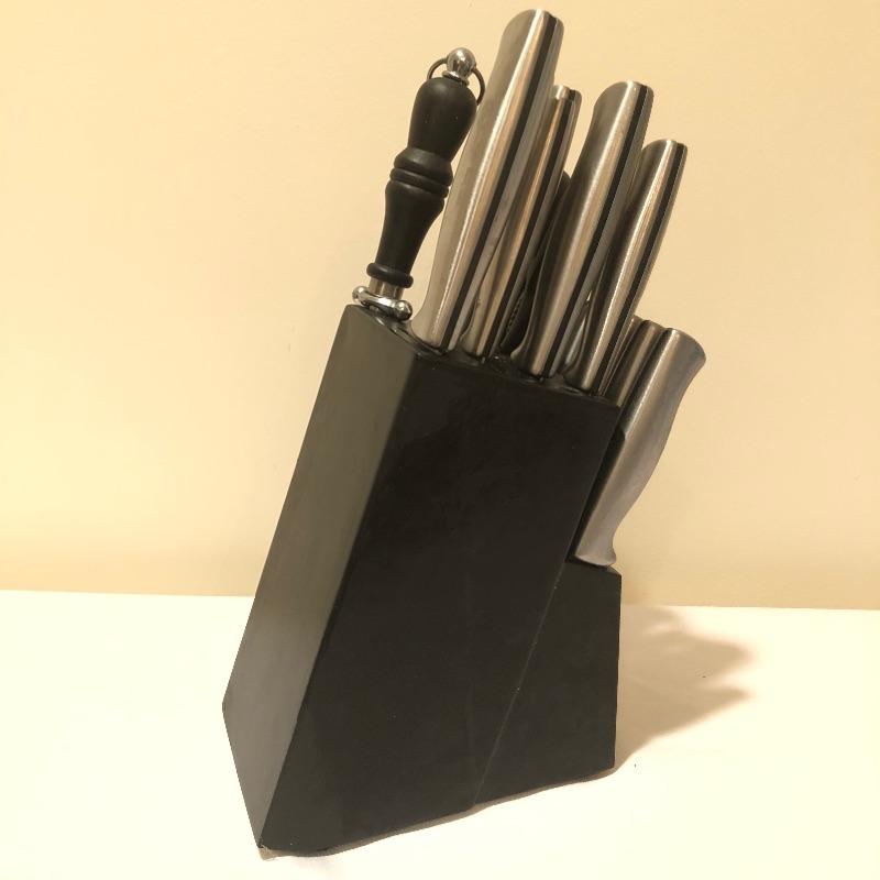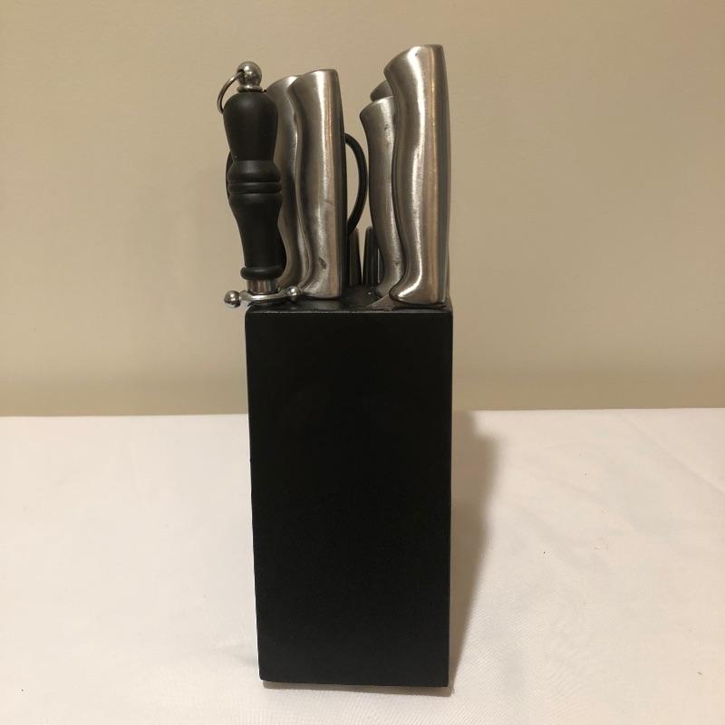 A knife for every job is here in this set that comes with its handy sleek black wooden holder that takes up only a little counter space. Set also includes a knife sharpener and a pair of scissors.
