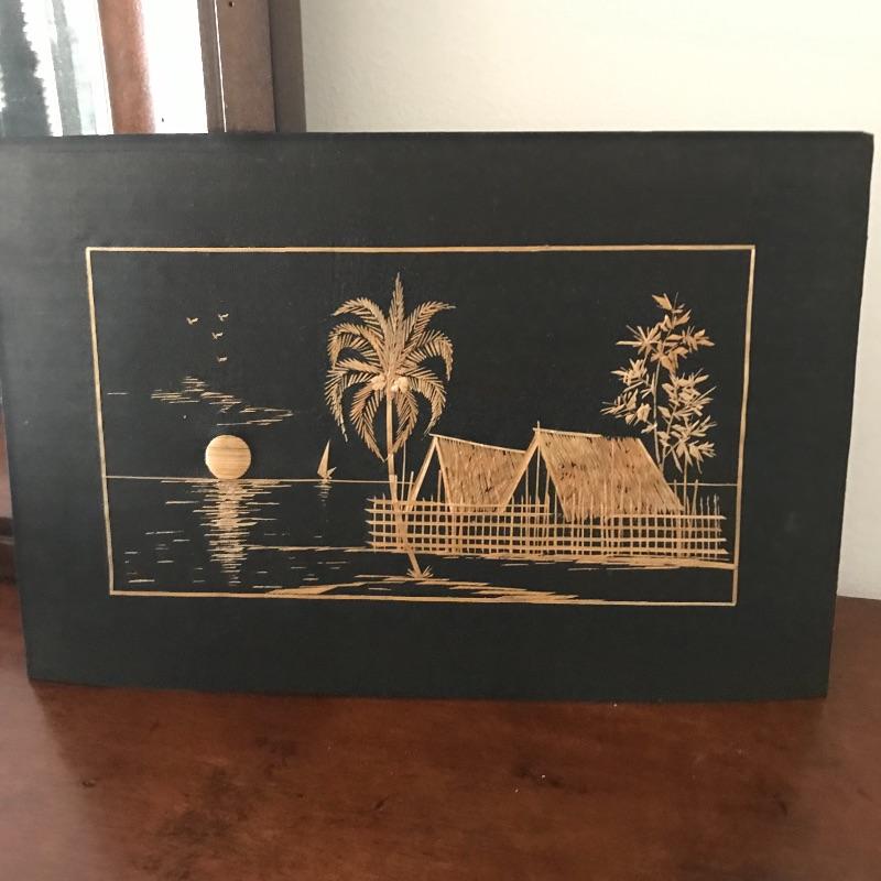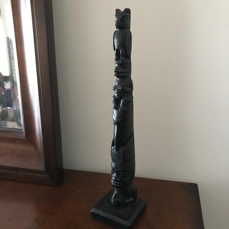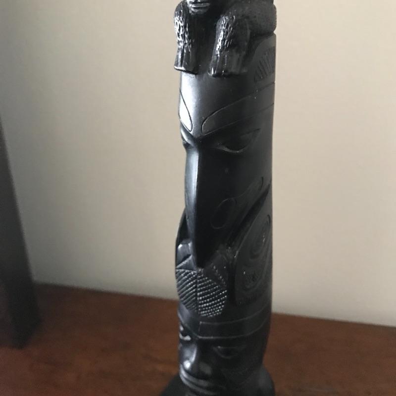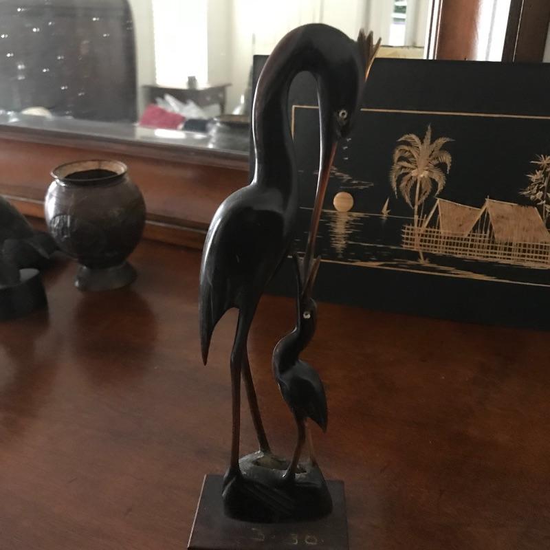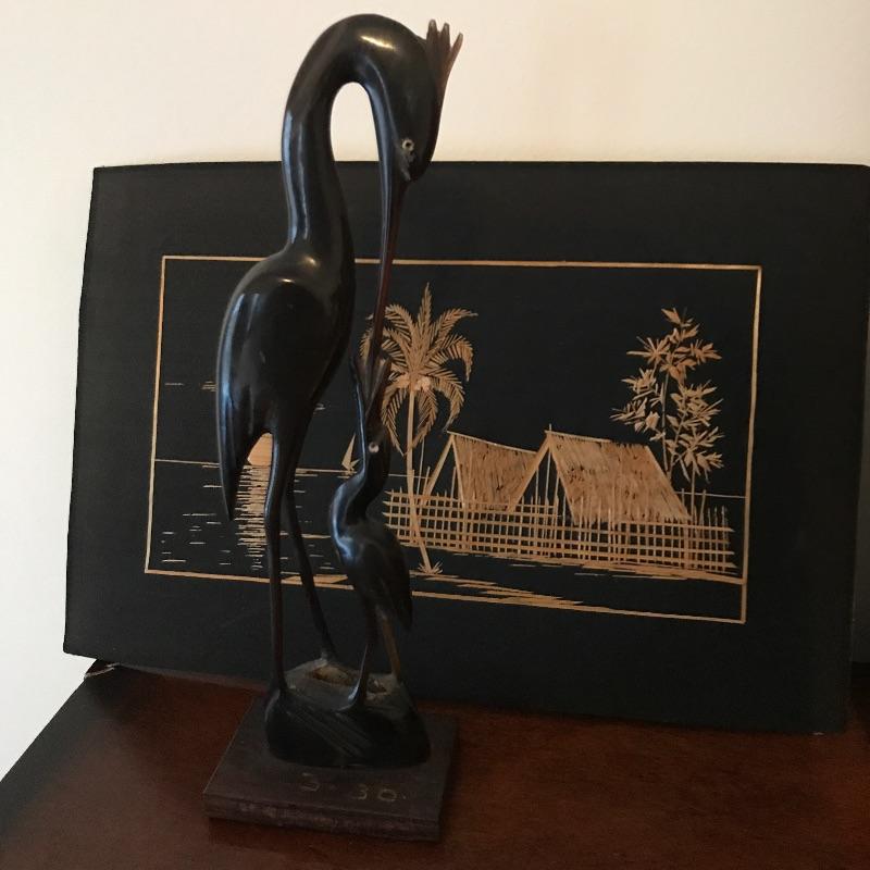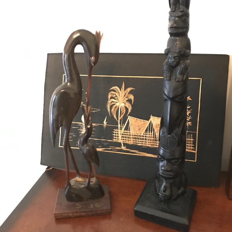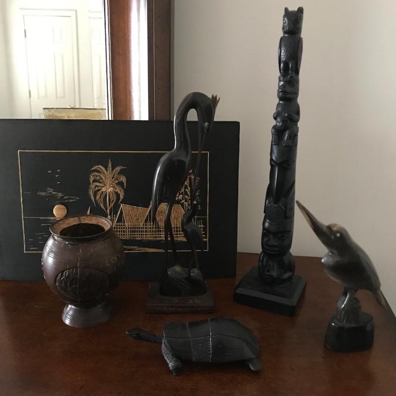 Lot includes several unique pieces, all with a dark brown wood finish, including two bird figurines, a wooden turtle, a carved coconut cup, a totem pole 13” tall, and art in black and gold depicting a tropical sunset 12” x 8” See pics. Can not guarantee material on birds and totem but they seem to be wood. Shipping available.