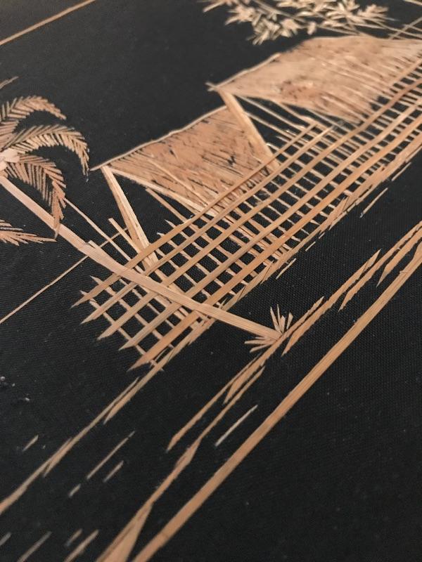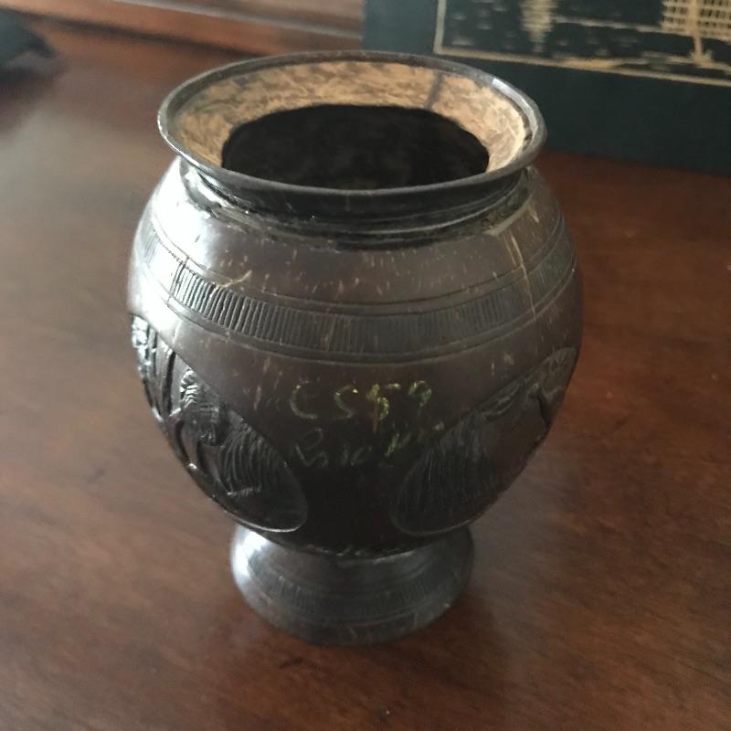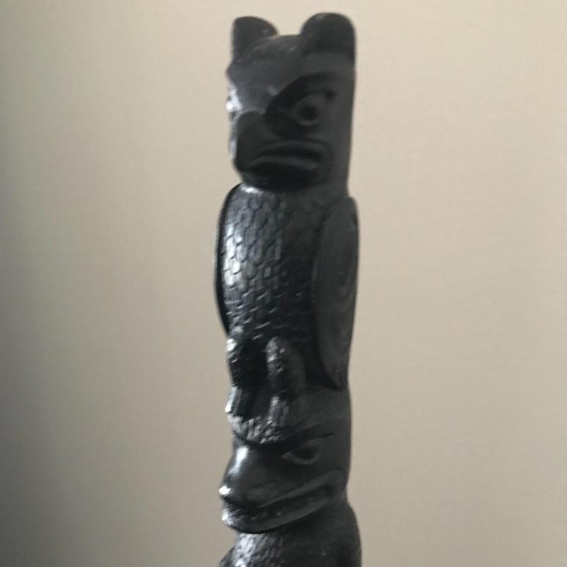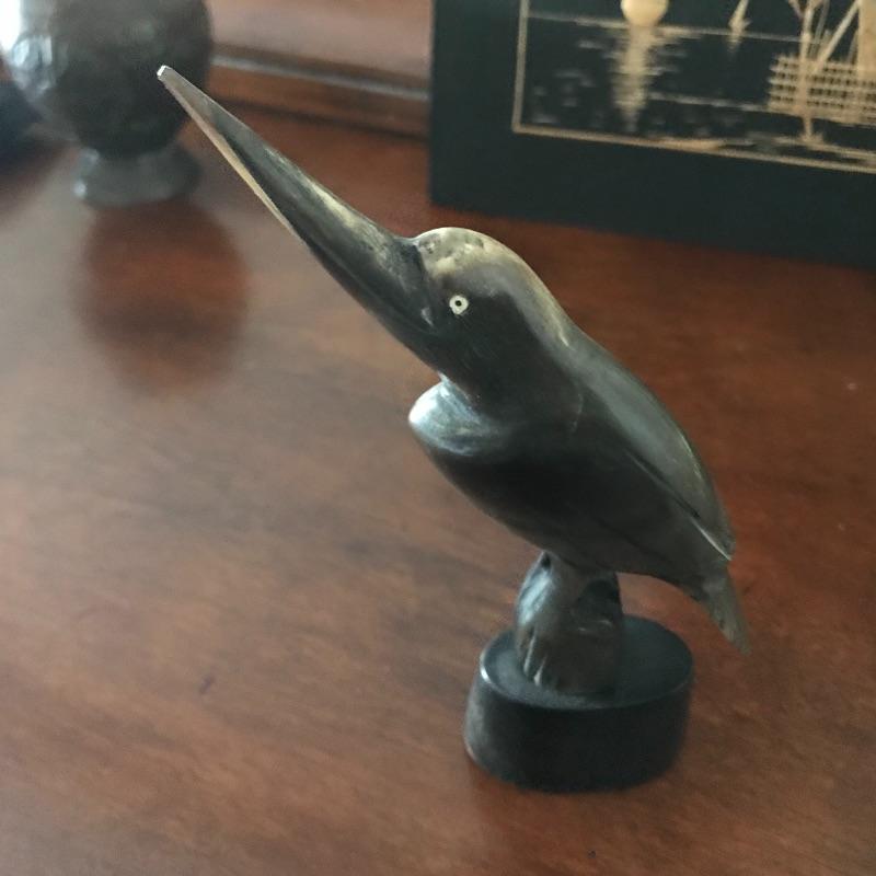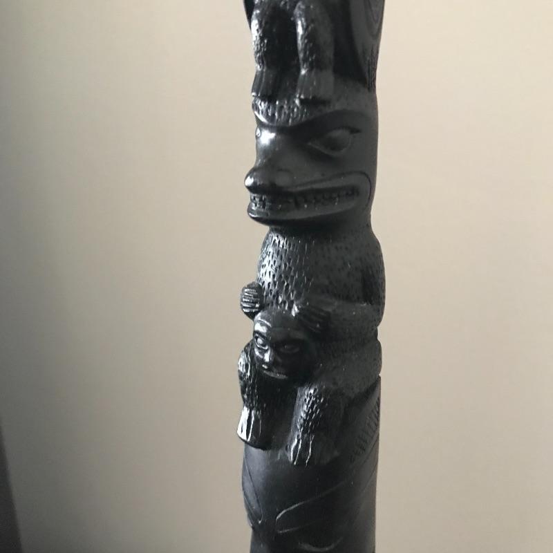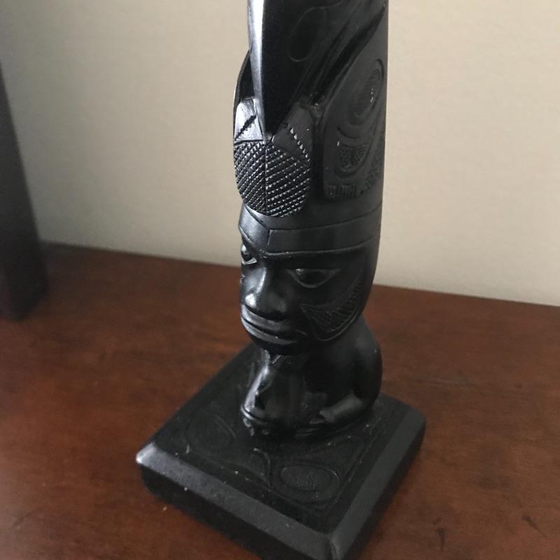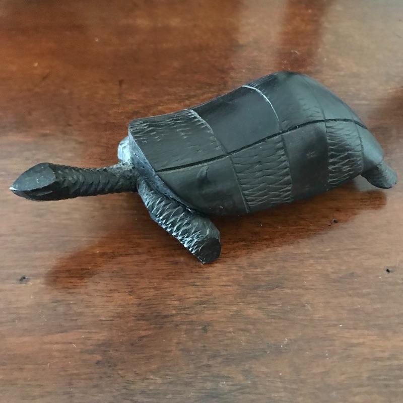 Lot includes several unique pieces, all with a dark brown wood finish, including two bird figurines, a wooden turtle, a carved coconut cup, a totem pole 13” tall, and art in black and gold depicting a tropical sunset 12” x 8” See pics. Can not guarantee material on birds and totem but they seem to be wood. Shipping available.