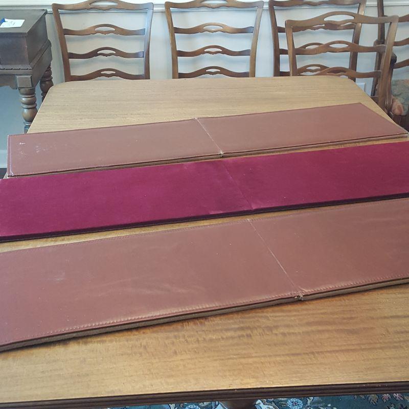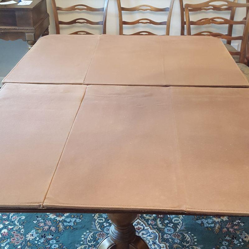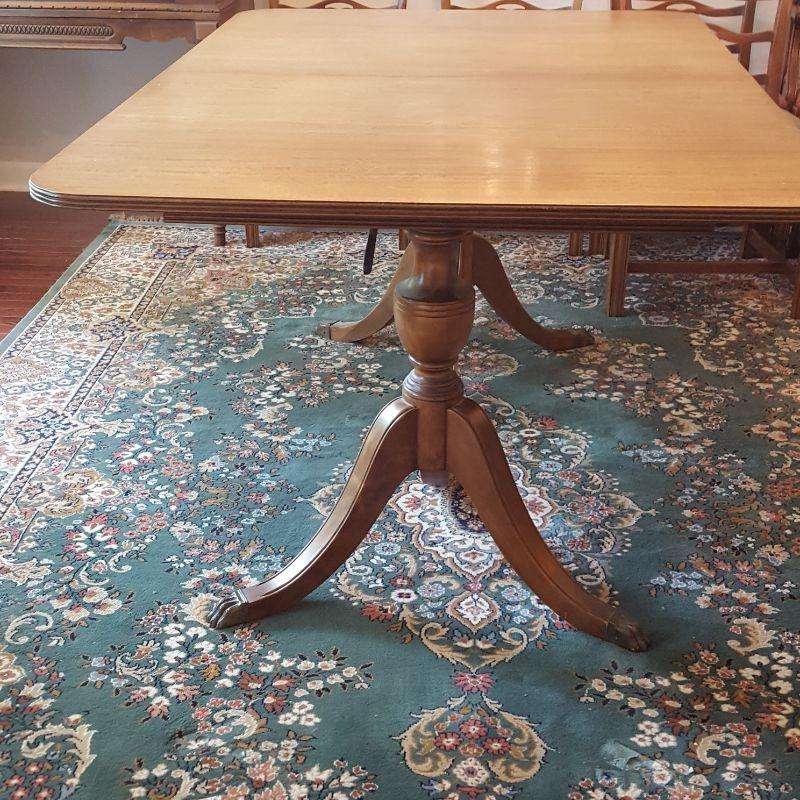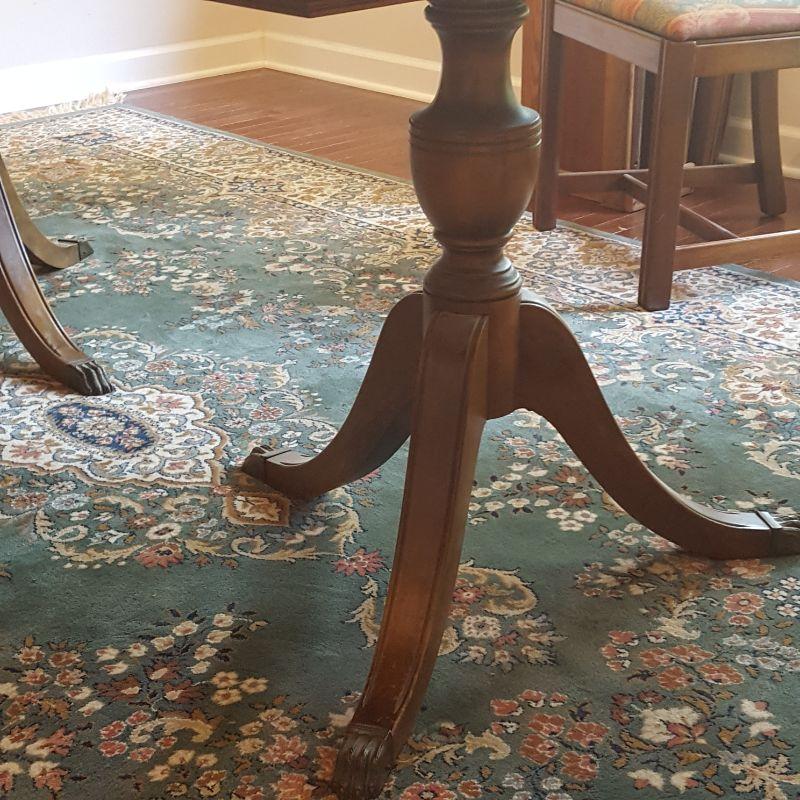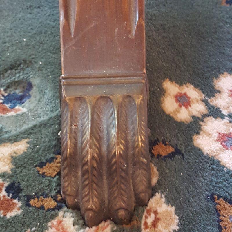 This elegant table includes 3 leaves and table top padding to cover the entire table with the 3 leaves inserted, see pictures. The details in this table are beautiful from the carvings to the brass feet this dining table will have you entertaining in style!. There are some signs of wear on the table top surface. The leaves have a wooden storage unit, that's a little wobbly, but won't fall down. Each leaf measures 11 inches, so you can add 33 inches for maximum entertaining! Lot 120 has 6 elegant chairs to go with this table.