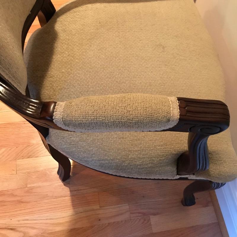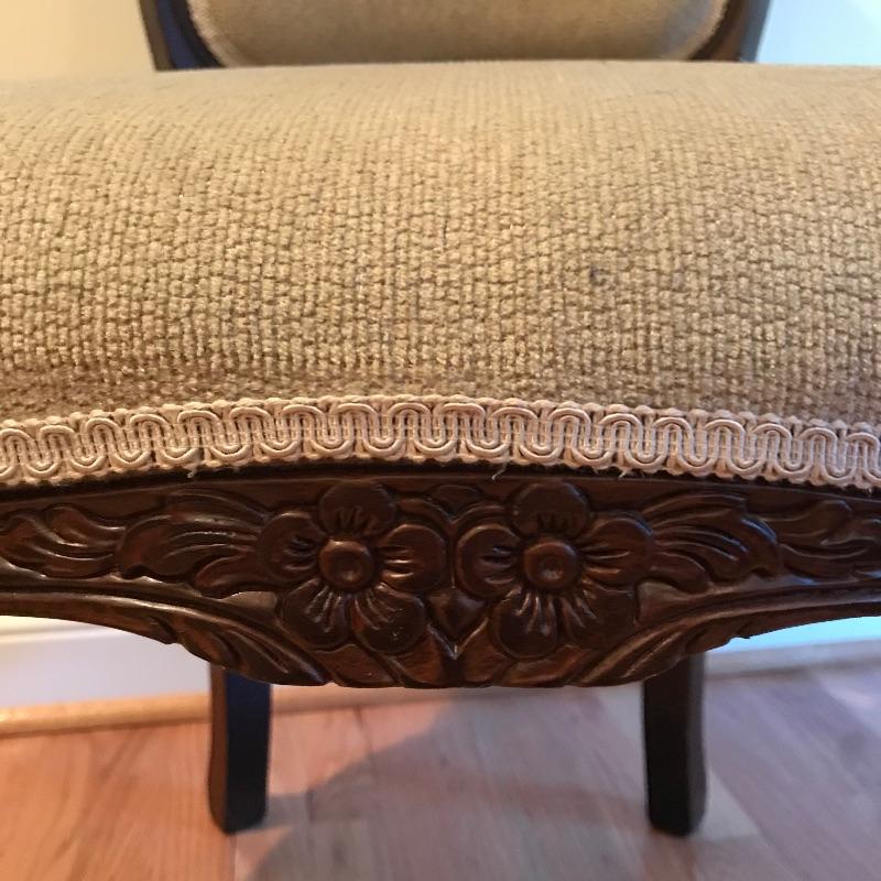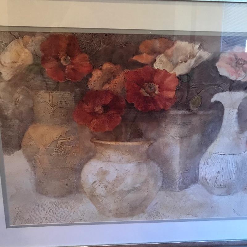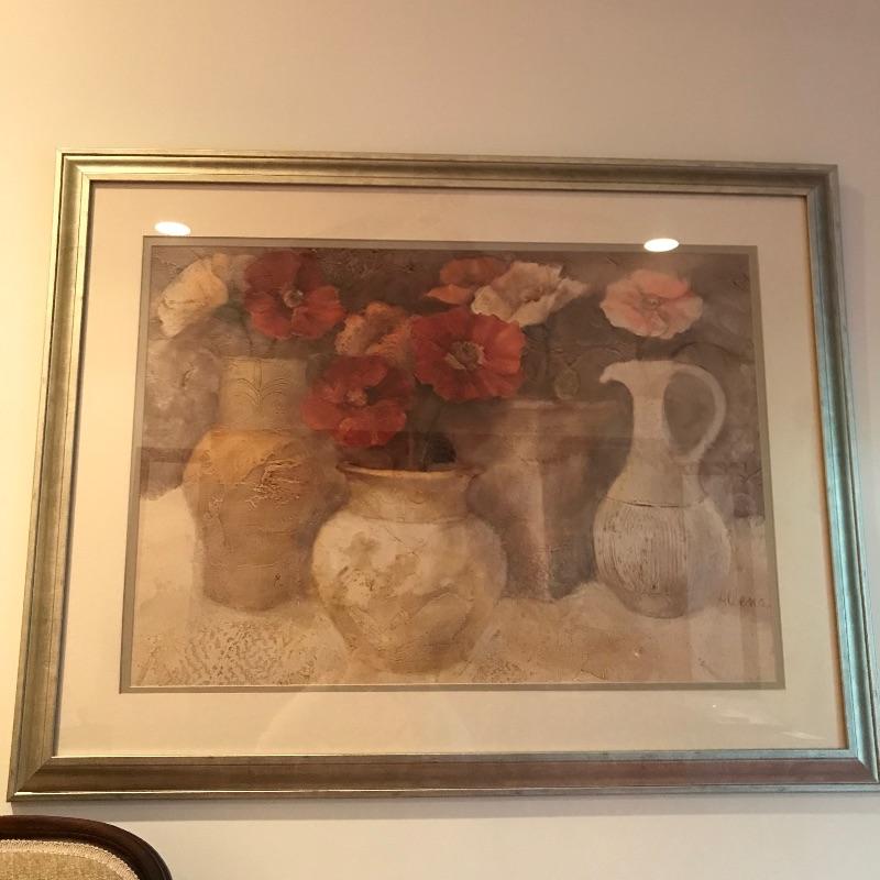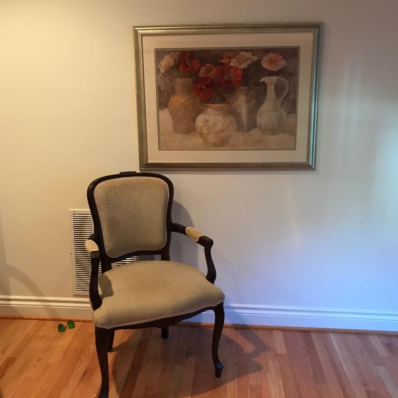 Spice up your sitting area with art and a comfortable chair by Najarian Furniture Co. It has a lovely ivory colored fabric chair with ornate wood frame measures 21” x 26” x 39” We’ve paired this chair with beautiful floral art with a textured canvas look. Art is matted behind glass and has what appears to be a printed signature "Albana" on the lower right side. See photos. Frame is painted wood and ready to hang, measuring 41” x 1 x 32”. See photos. No shipping.