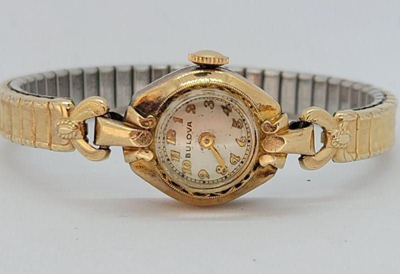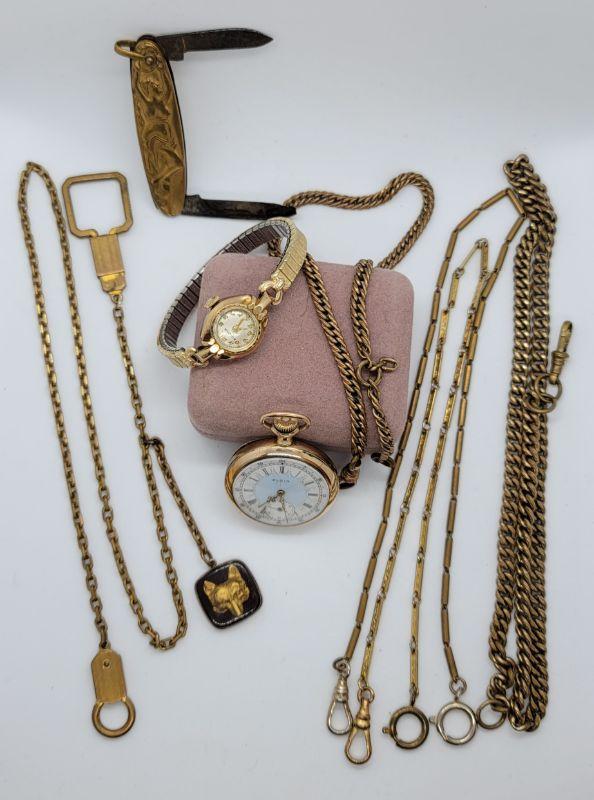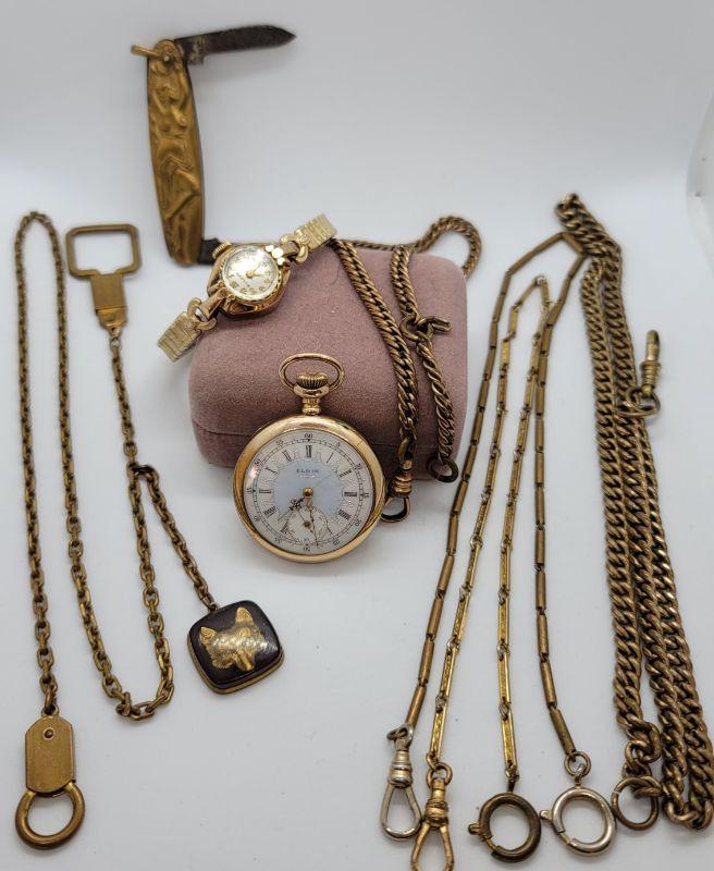 Lot 119: Gold filled Elgin Pocket Watch WORKS, Gold filled Ladies Bulova wristwatch WORKS, Art Deco pocket knife and more!,