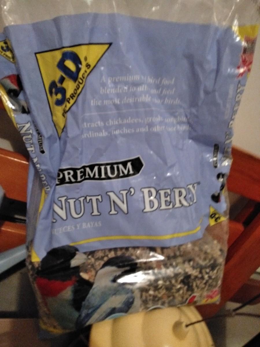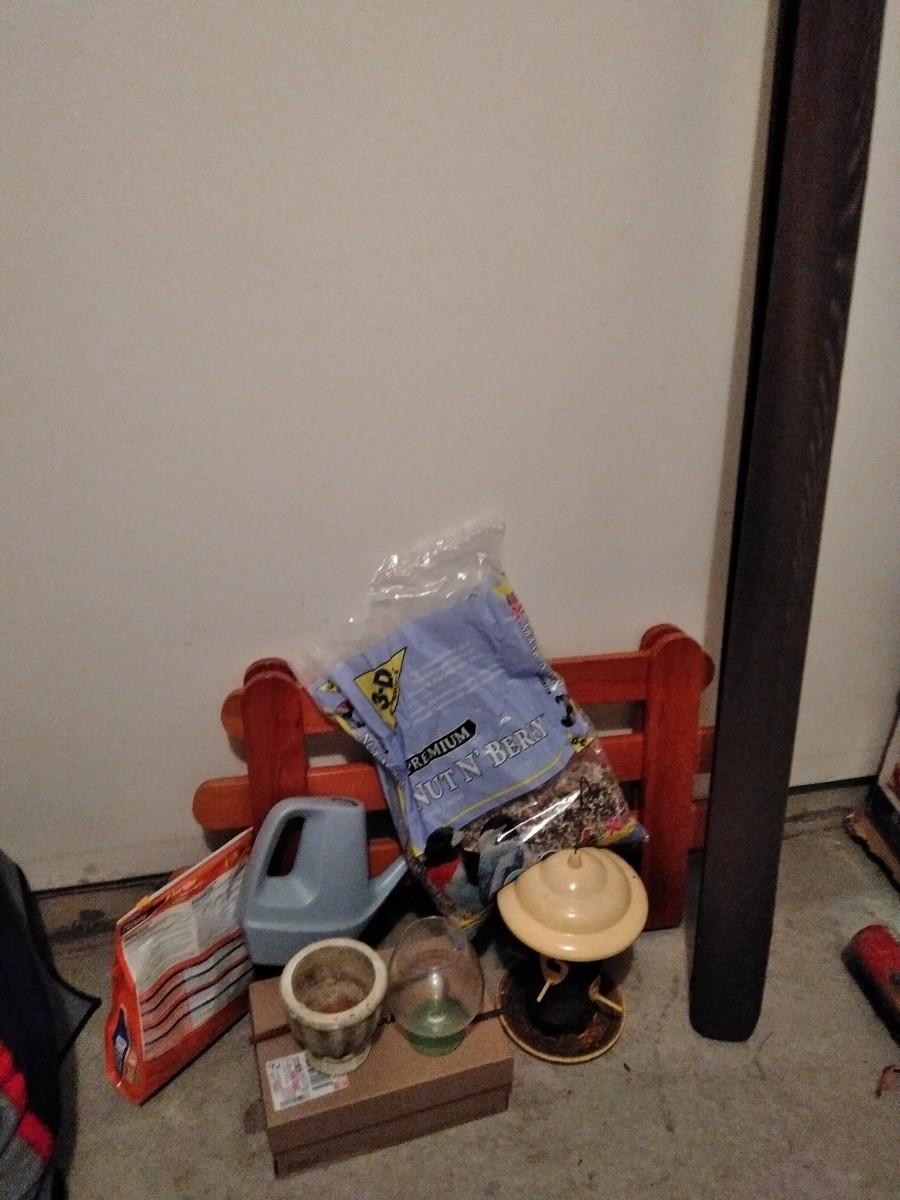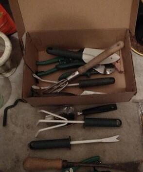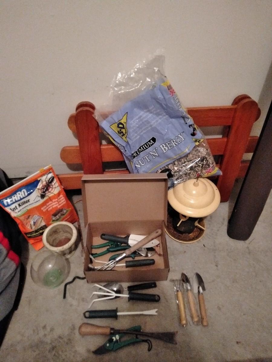 GARDENING ITEMS INCLUDING HAND TOOLS, NUTS AND BERRY PARTIAL BAG OF BIRD FOOD. ANT KILLER, FLOWER POT, LONG SUN SHADE BLIND, WIND CHIMES (THE WOOD IN THE BACKGR0UND AND YELLOW BIRD FEEDER ARE NOT INCLUDED.)