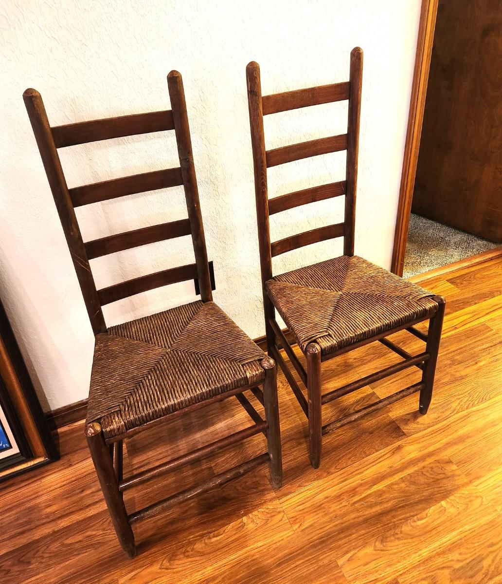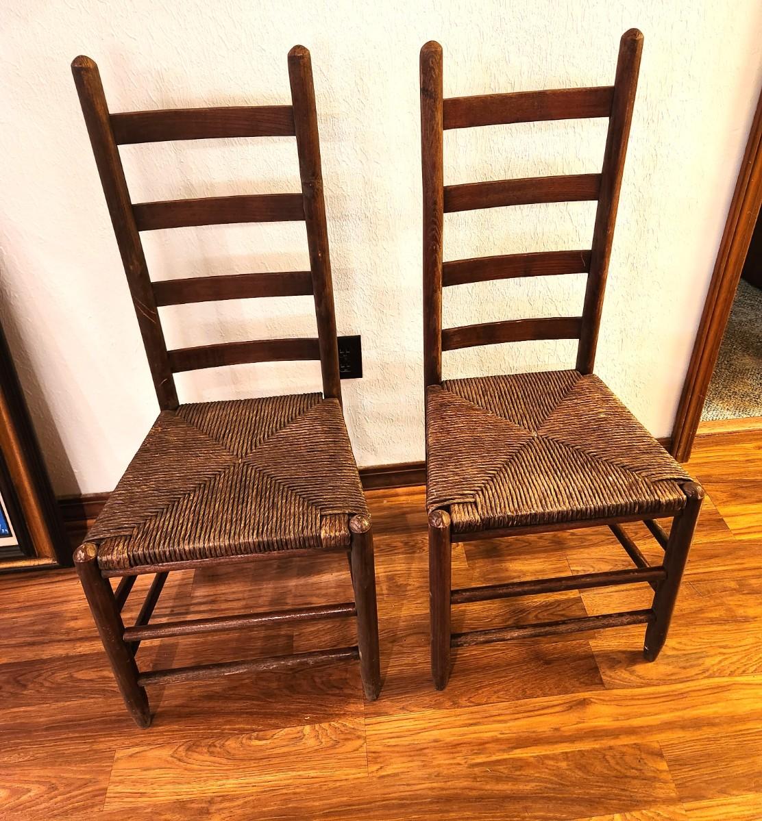 Good pair of classic rush bottom, ladder back side chairs. 17" wide and 42" tall. Sturdy.