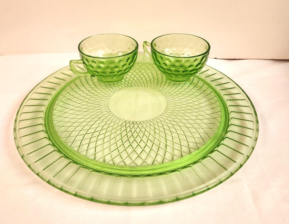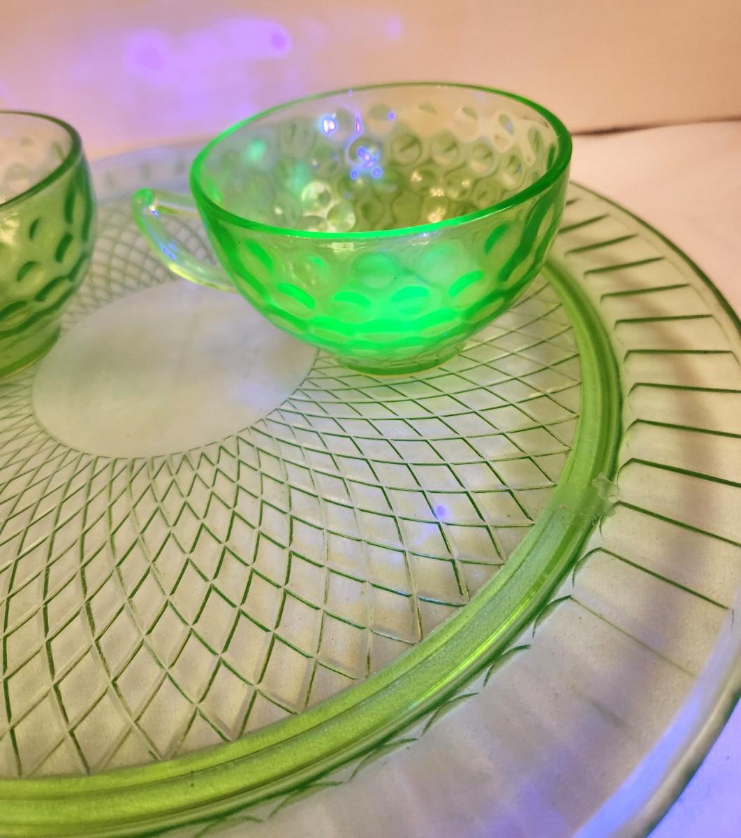 Green Depression-era cake plate - a generous 13" across, and 2 Fire king cups - (they GLOW) - uranium glass. All in good condition.
