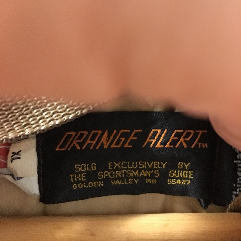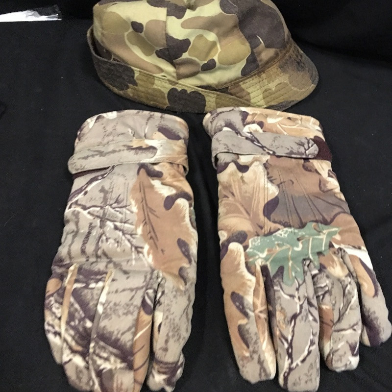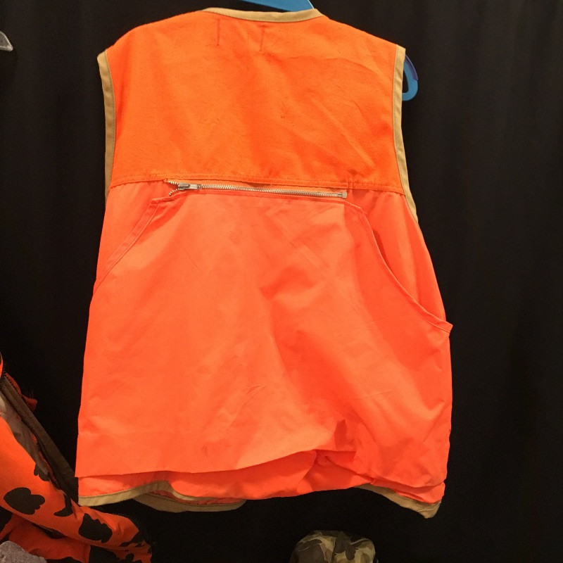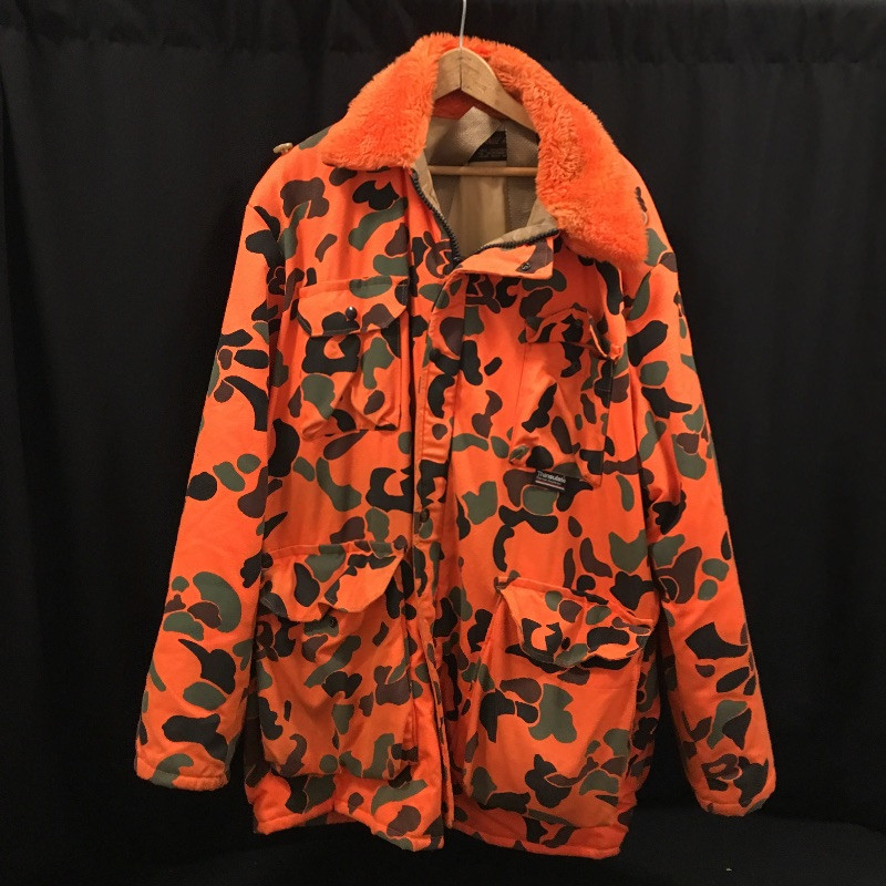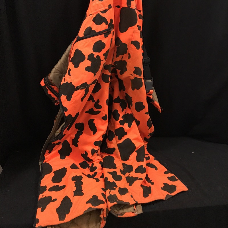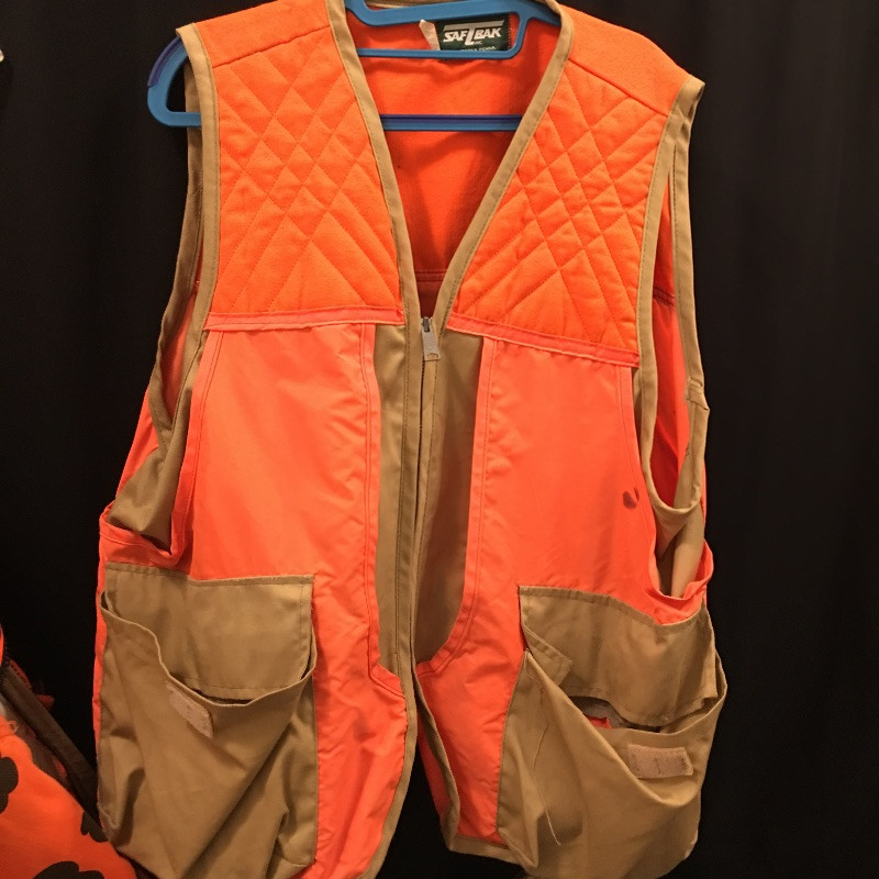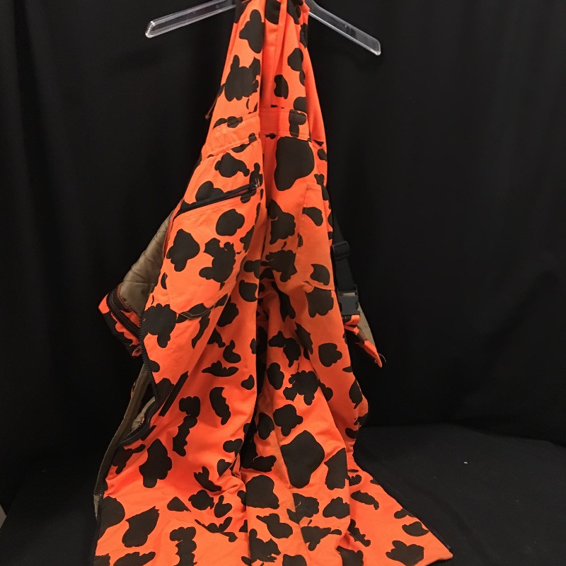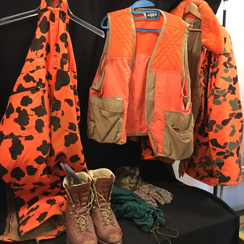Hunting essentials includes orange camouflage jacket and overalls, orange vest, gloves, hat, pants protectors and a pair of hiking boots size 10 E. Be ready for hunting season with this great assortment of hunting essentials.
