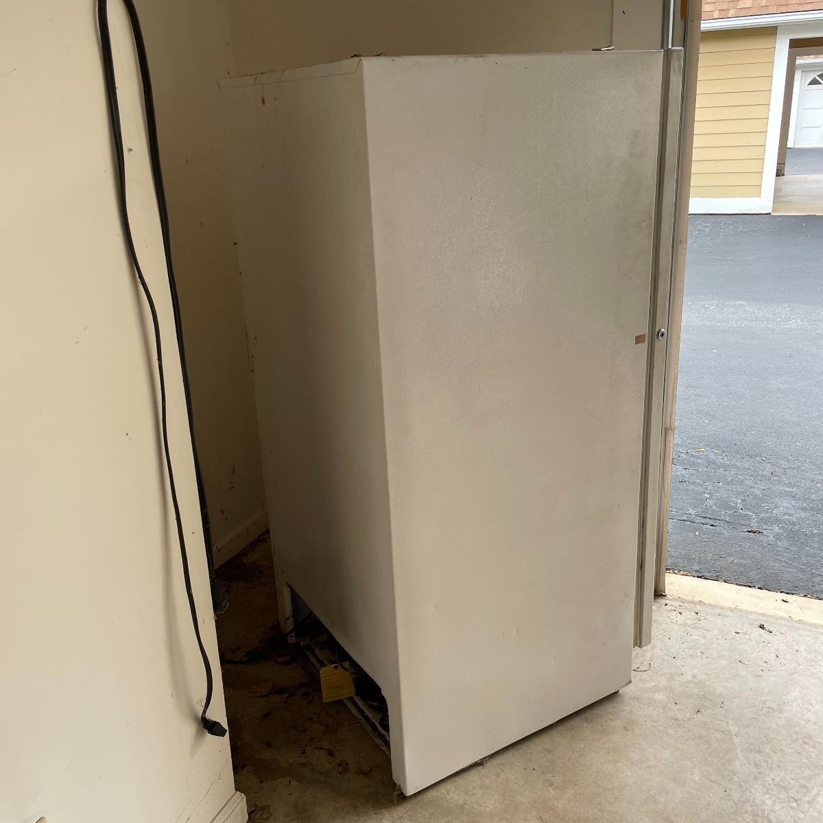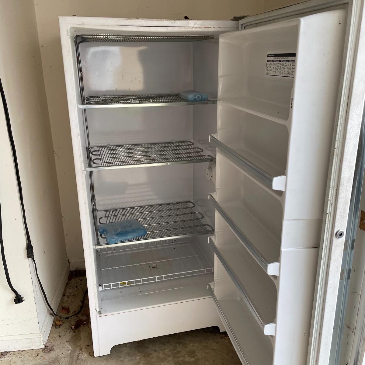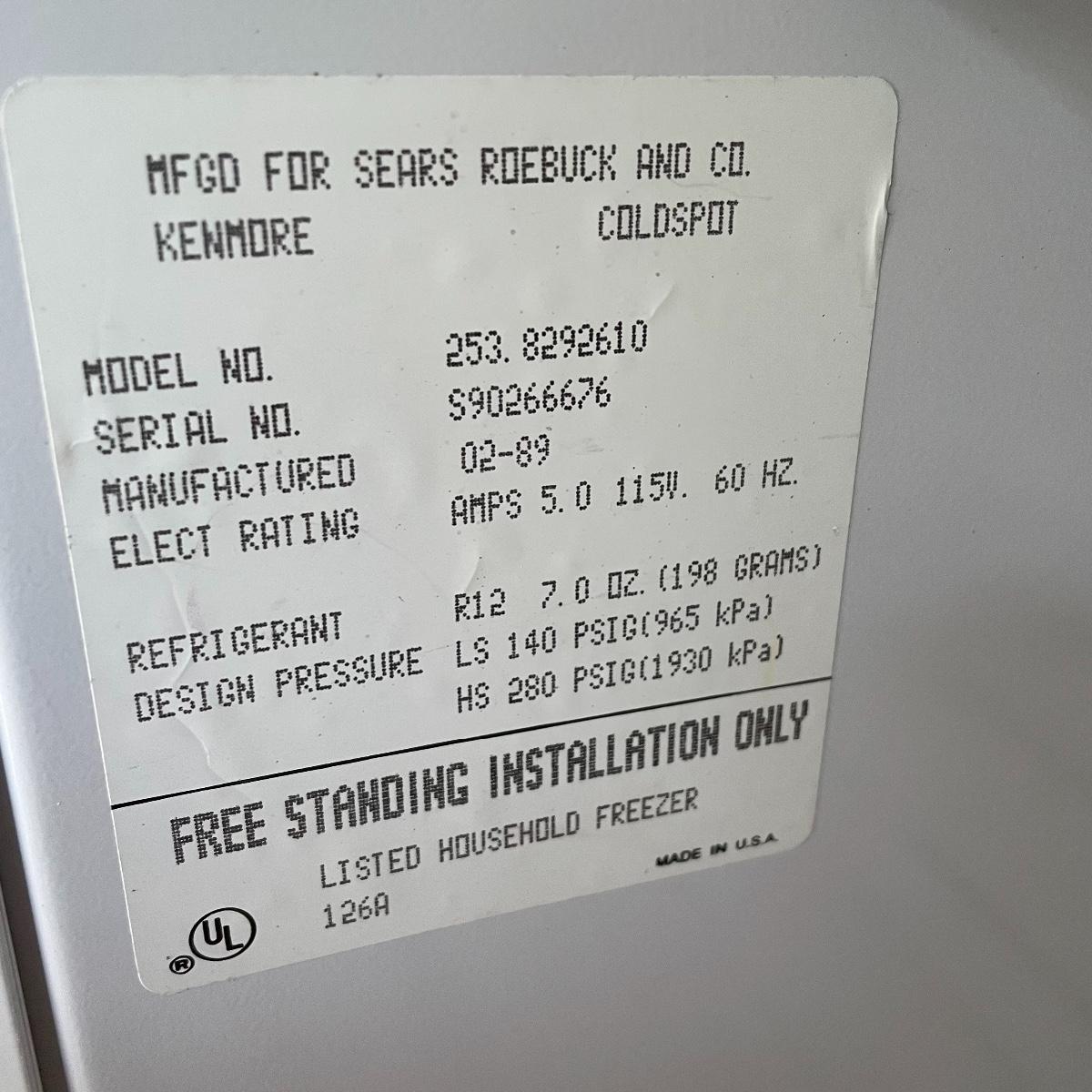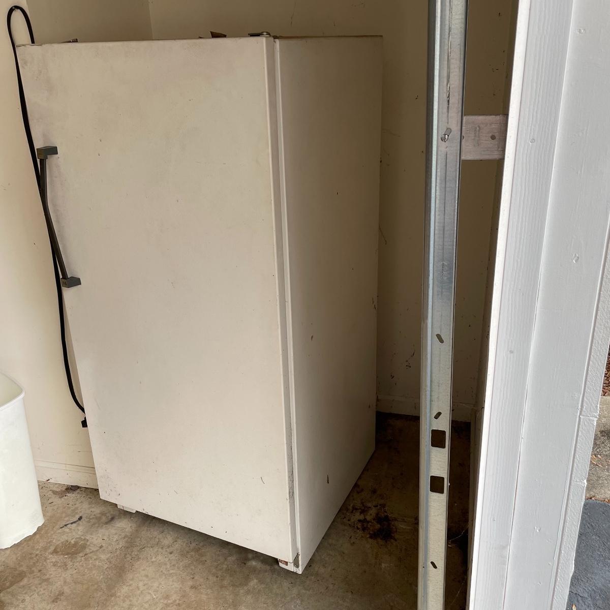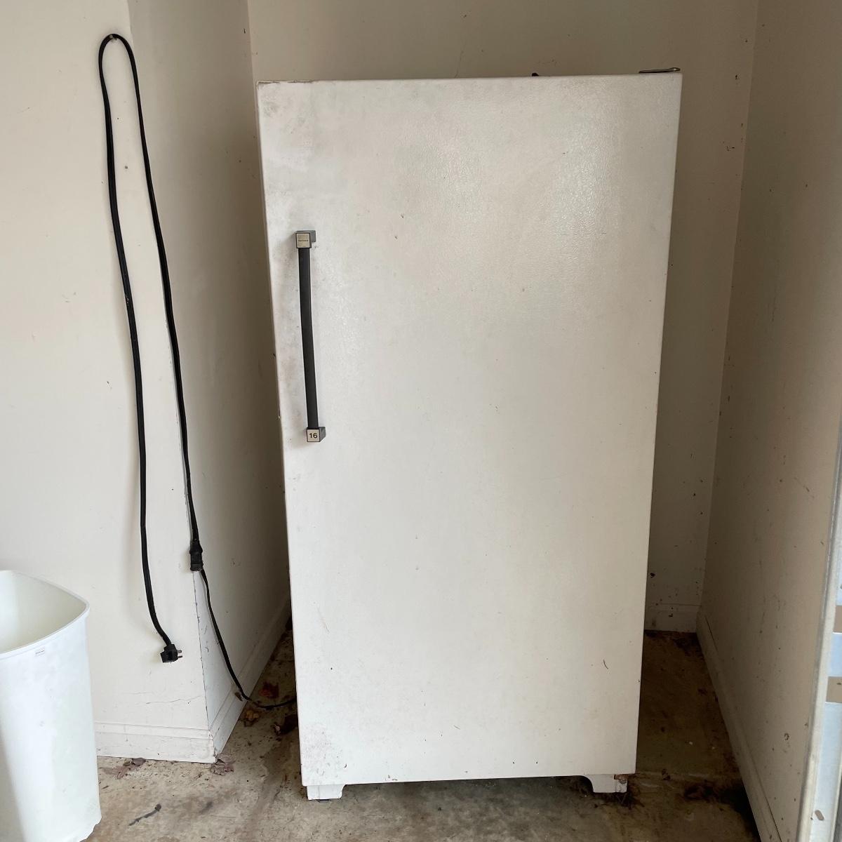 Nice size for a garage or basement to keep your extra frozen goods. This Kenmore appliance measures 28” x 28.5” x 59.25” and was working when we arrived, it has been unplugged and defrosted. Freezer is equipped with key. It needs a good cleaning on the outside, but the inside appears very clean. Local pick up only. Please bring help to load, freezer is conveniently located in garage off the driveway.