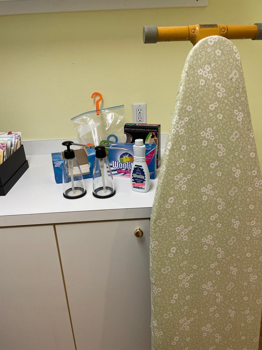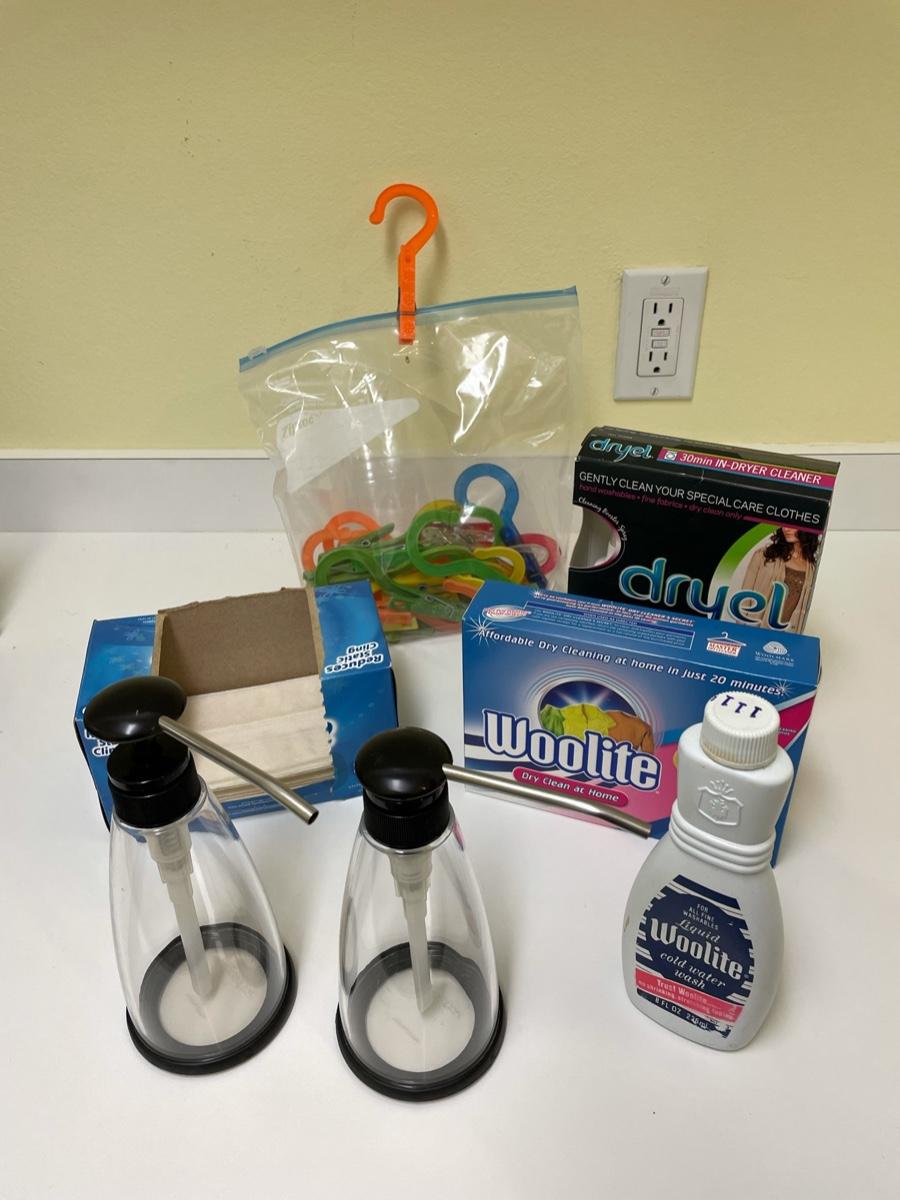 Ironing Board, bag of hanging clothespins, Dryel Package, dryer sheets, Woolite dry clean sample, pair of hand soap dispensers and a bottle of Woolite