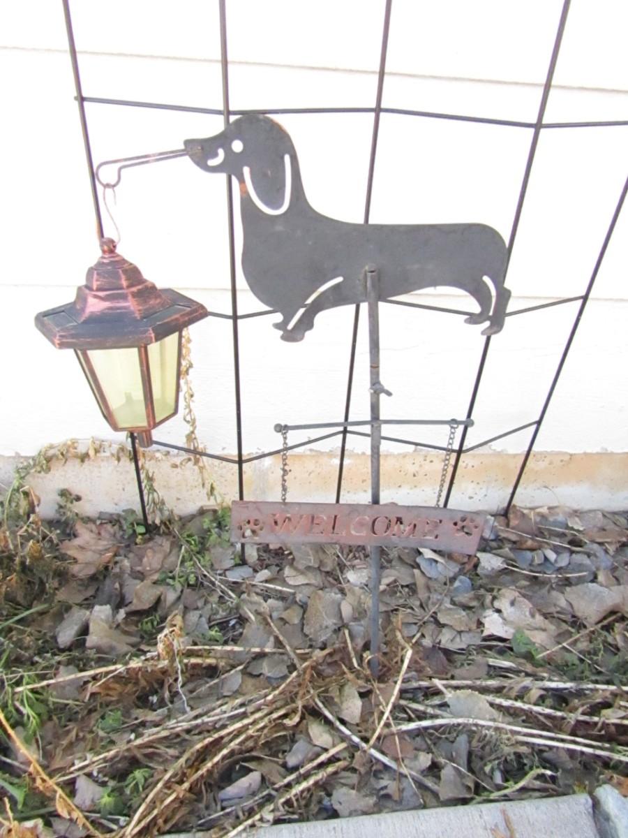 UNIQUE OUTDOOR PLANT TRELLIS 25X64, DOGGY WELCOME SIGN WITH SOLAR HANGING LAMP (DONT KNOW IF IT WORKS)