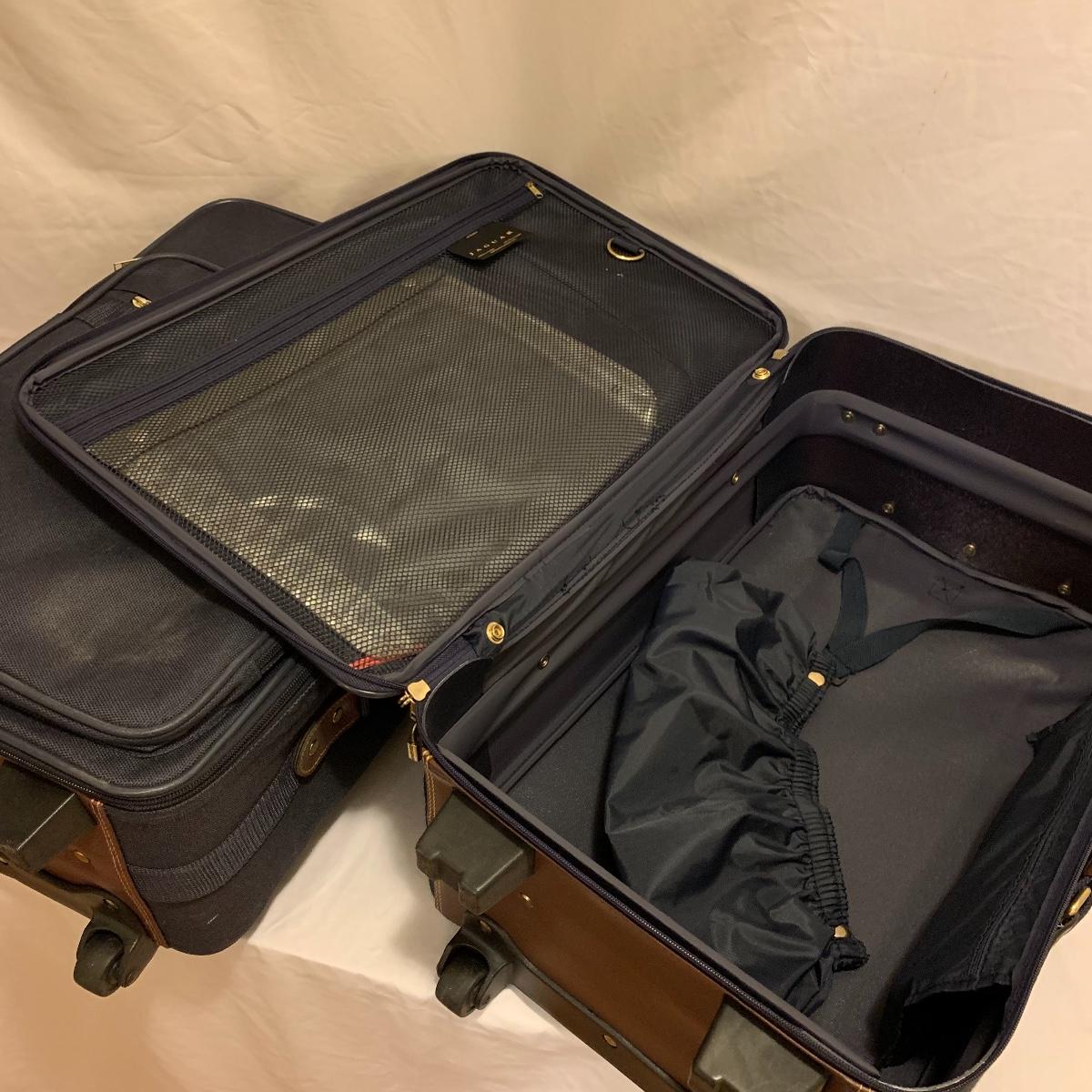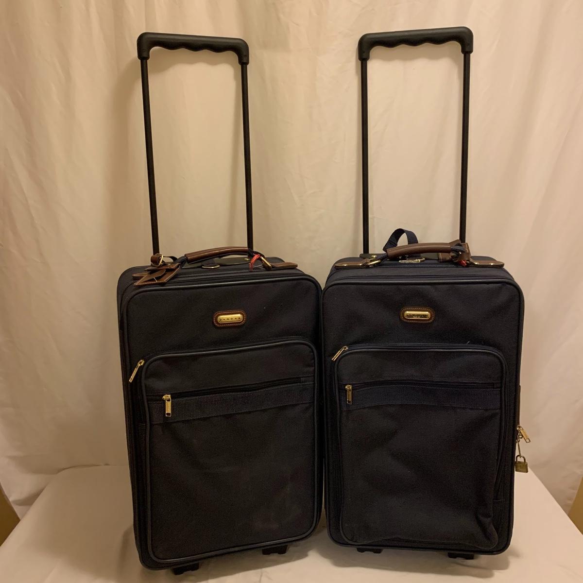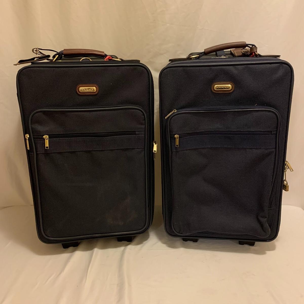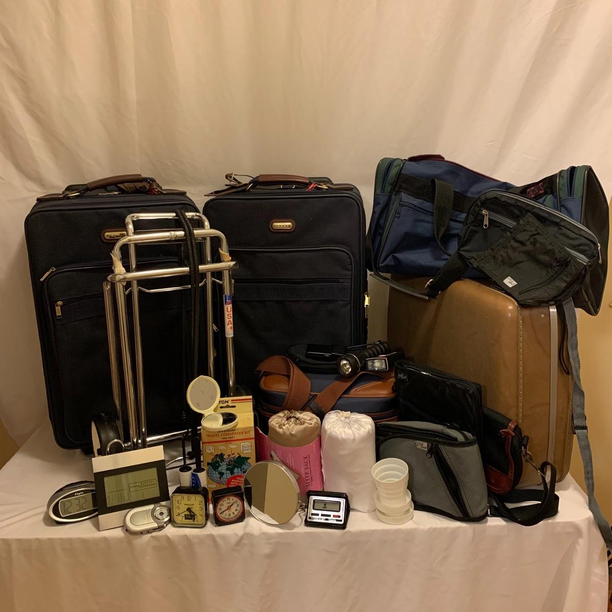 In this lot you’ll find quite a collection of travel accessories! There are two small navy blue carry-on sized Jaguar suitcases that both have multiple pouches and pockets inside and out, wheels, and retractable handles. There’s also a vintage brown hard shell American Tourister suitcase, as well as a Jaguar toiletry bag and a Color Blocks duffel bag. There’s also a metal wheeled luggage caddy. Also included is a variety of travel accessories. There are two new Travel Fresh Personal Sleep Sacks, a Recoton Safe N Sound Travel Converter Kit, a couple of mirrors, flashlights, travel radios, and travel clocks (one is still ticking now!). There are also some Eagle Creek travel pouches and passport carriers and an Appalachian Trail Fanny pack. Local pickup only.