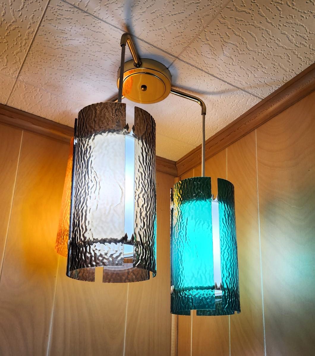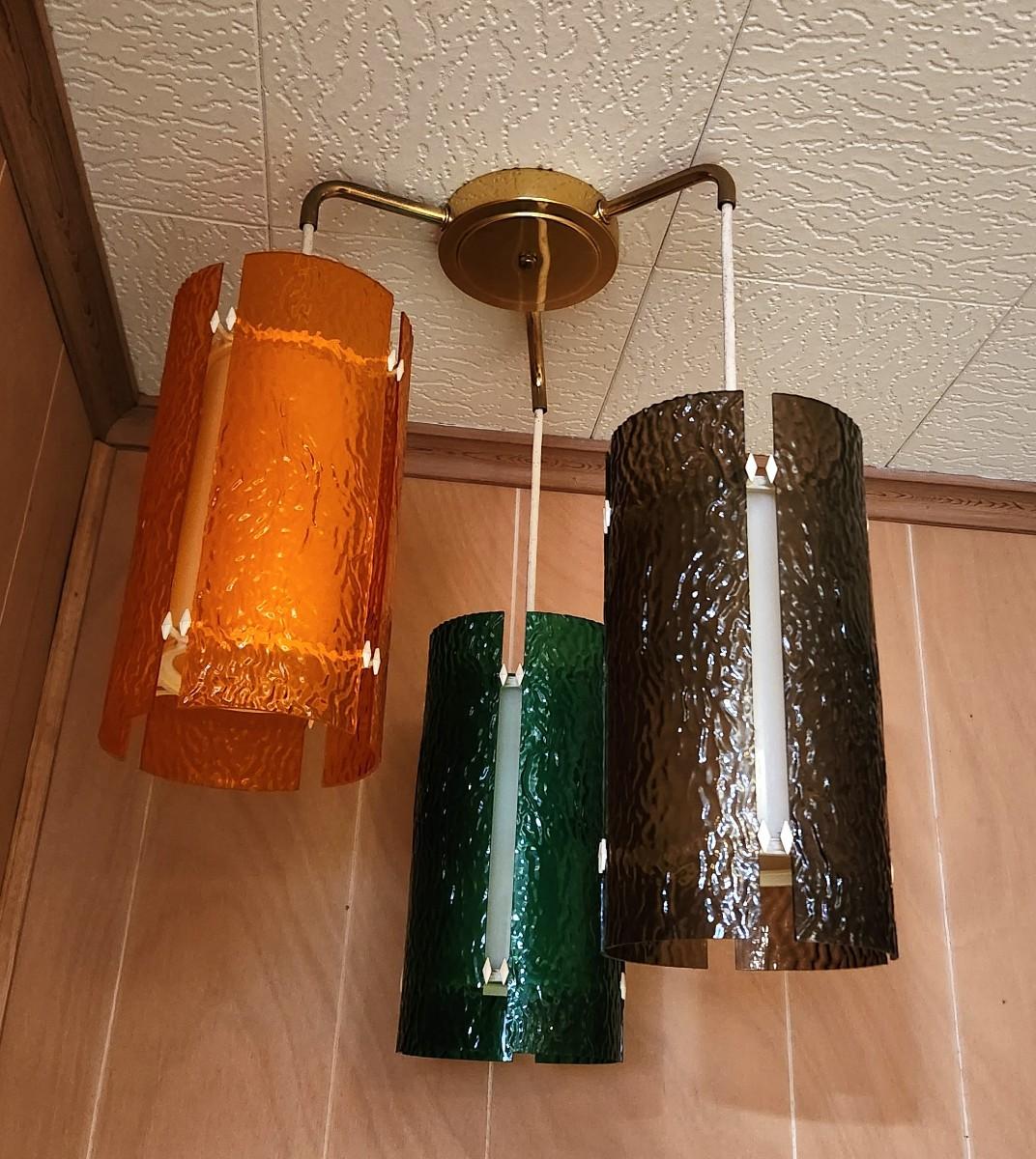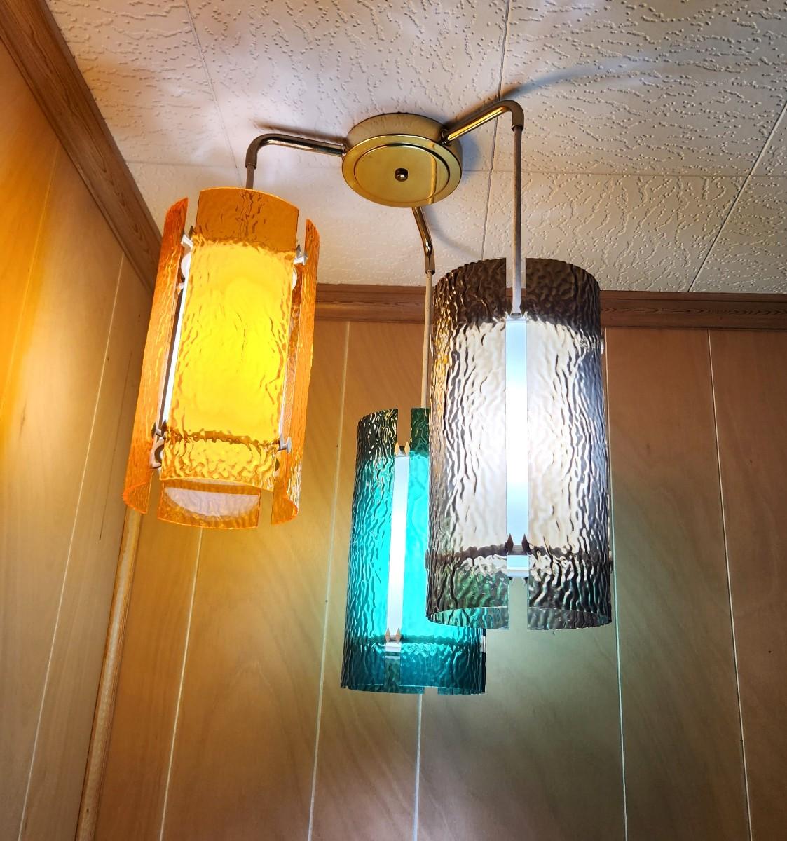 This fixture is original to the house - great 1960's hanging 3-lamp light - works - shades each 12" long - shades are plastic Hangs 26" from ceiling. Very scarce.