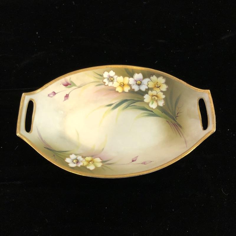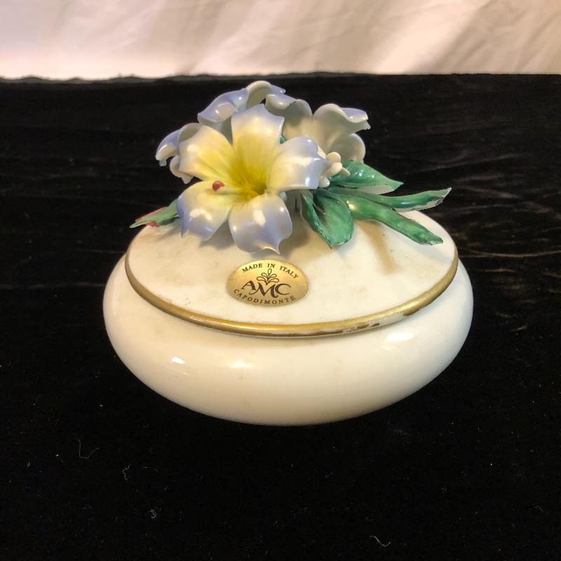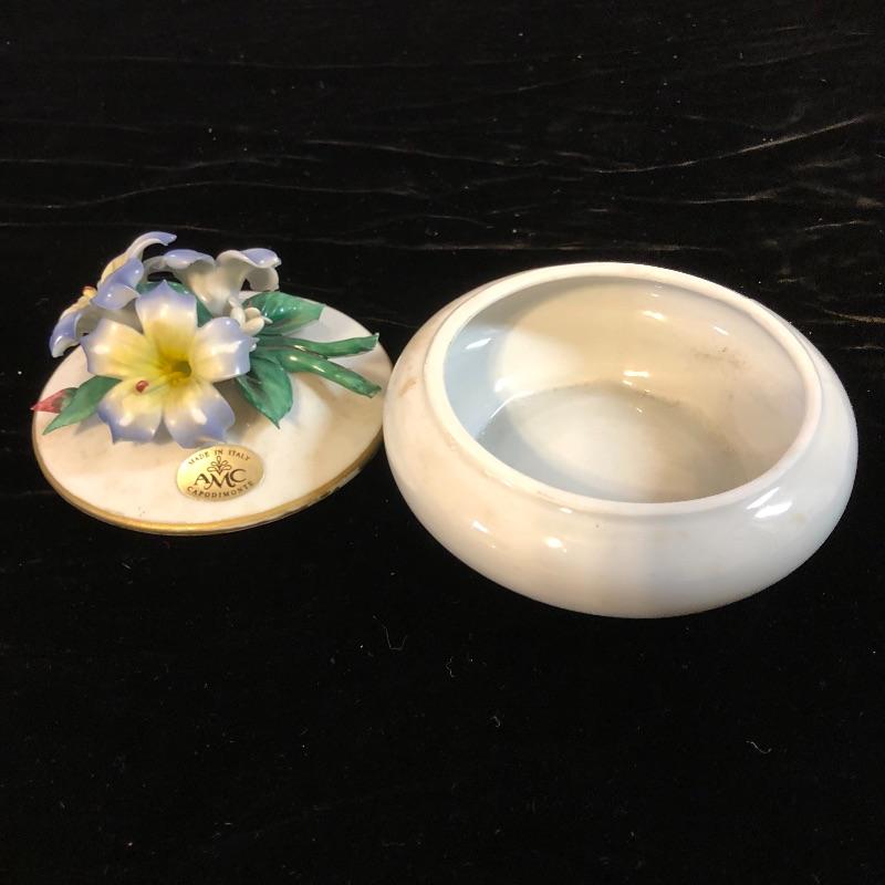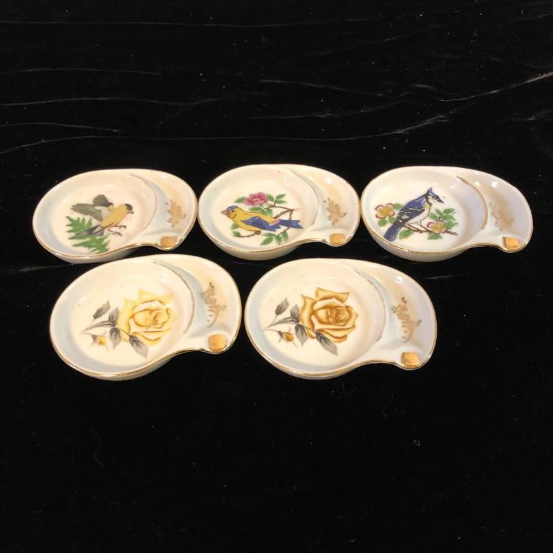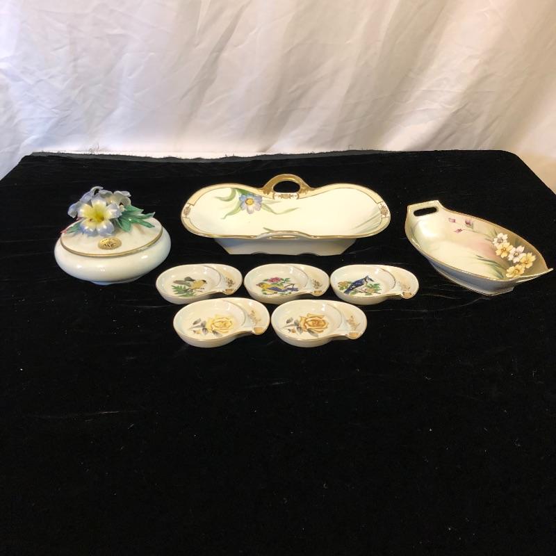 A eclectic collection of vintage China. Lot includes two Nippon hand painted bowls, Capodimonte bowl with floral lid and five Bridge ashtrays with birds and flowers that are unmarked.