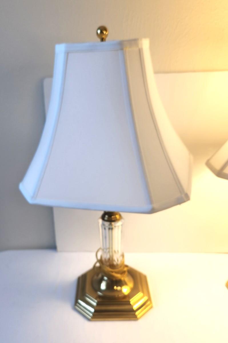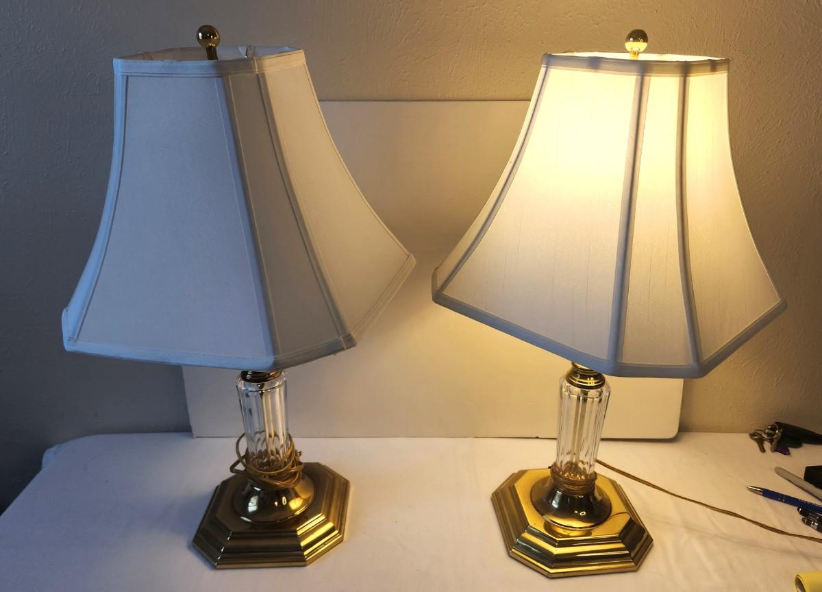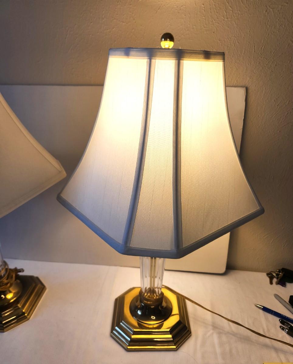 These table lamps are in good working condition, but they are little imposters - what looks like brass is really plastic, what looks like glass is also plastic. Each 24" tall.