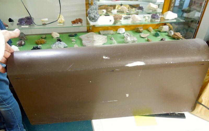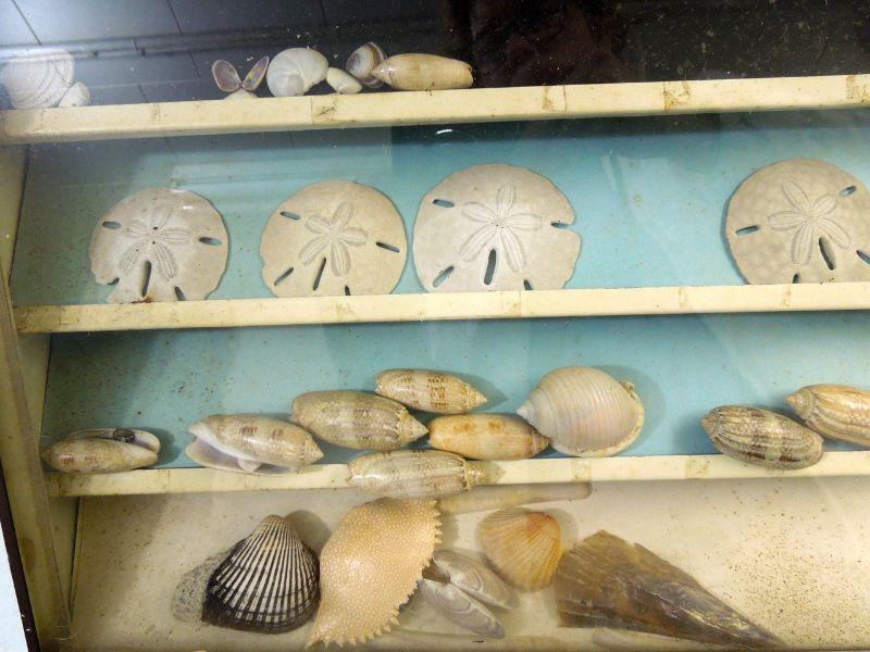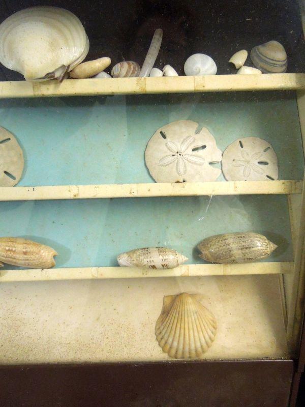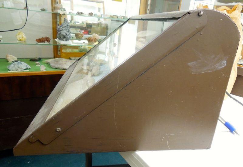 Metal wedge display case with glass front measures 23"W x 17"H x 15"D. Sea shells and sand dollars included.