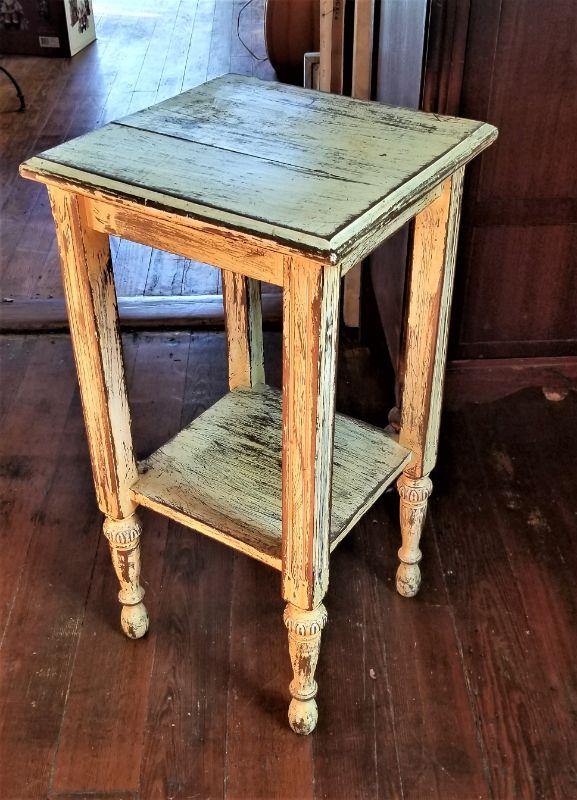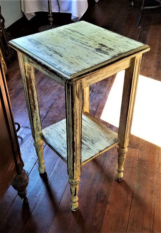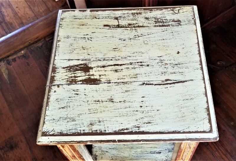 Small vintage side table - solid wood - has been painted. 27" tall, 14" x 14" top. Used condition - see photos.