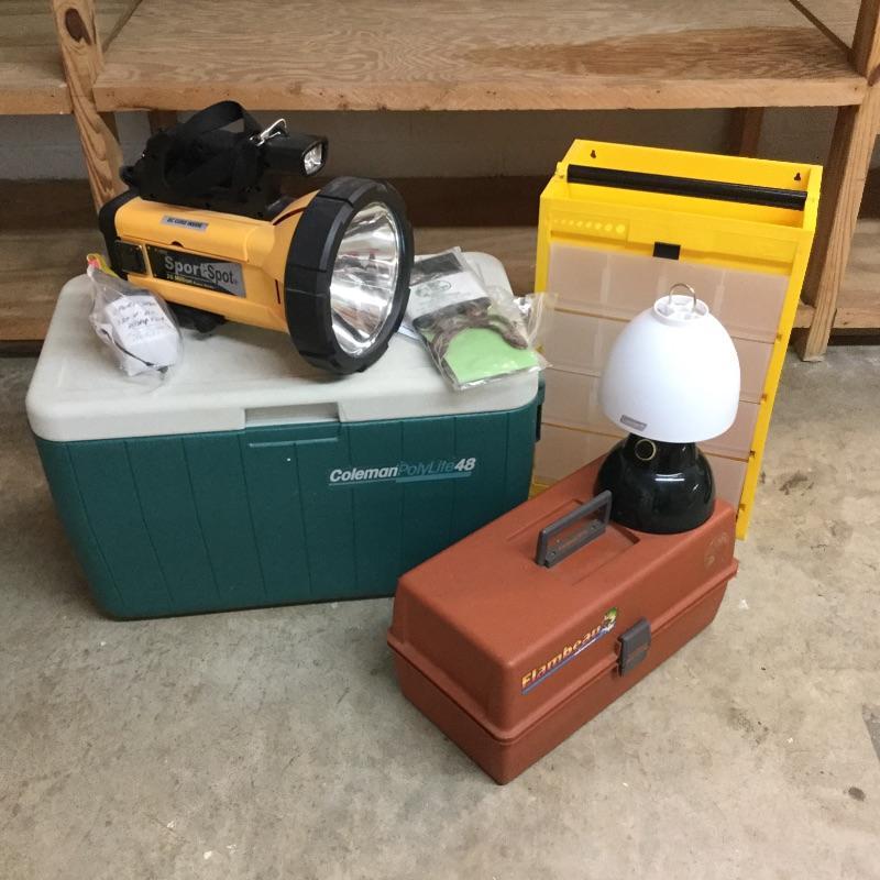 Lot includes: a Vector Cordless, Rechargeable 3 LED Auxiliary Light w 12 Volt DC Power Supply, a Coleman Polylite48 cooler with handles, a Flambeau Adventurer Tackle Box never used, a Coleman Battery operated Lantern, a Plano Tackle/ Gear organizer and more.Local Pick up only.
