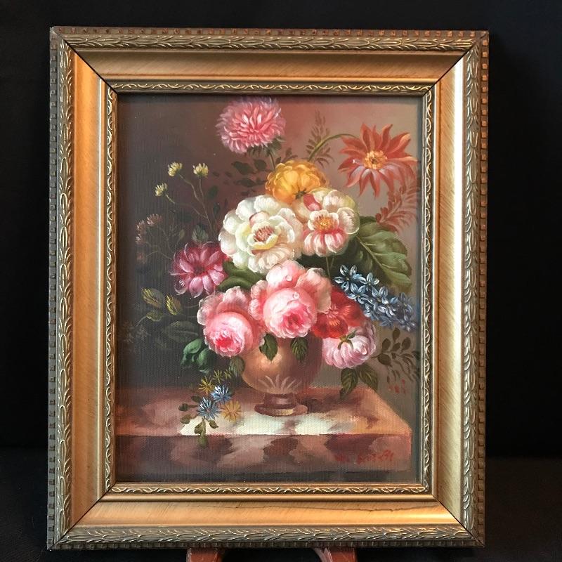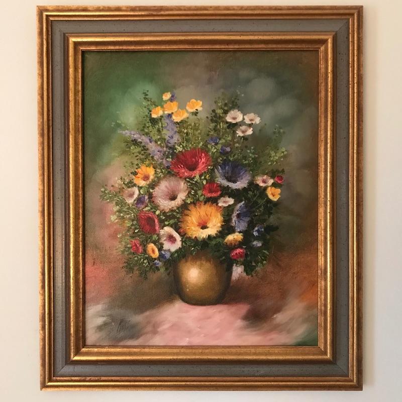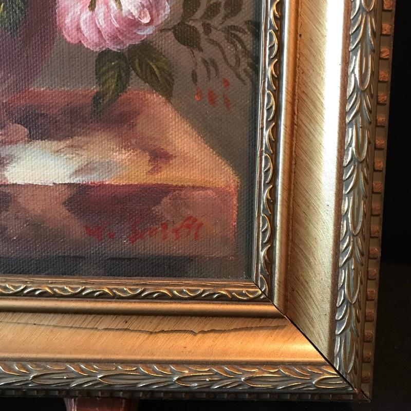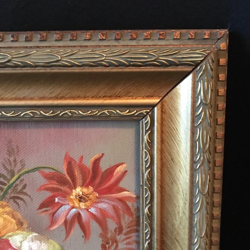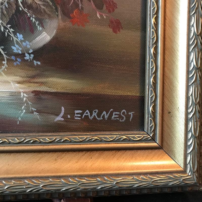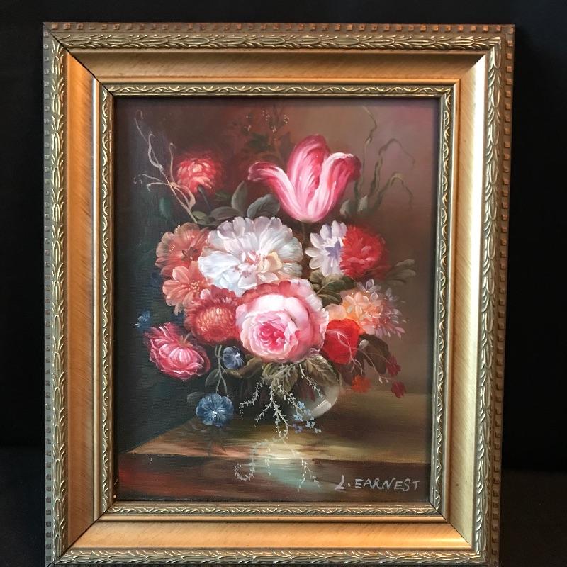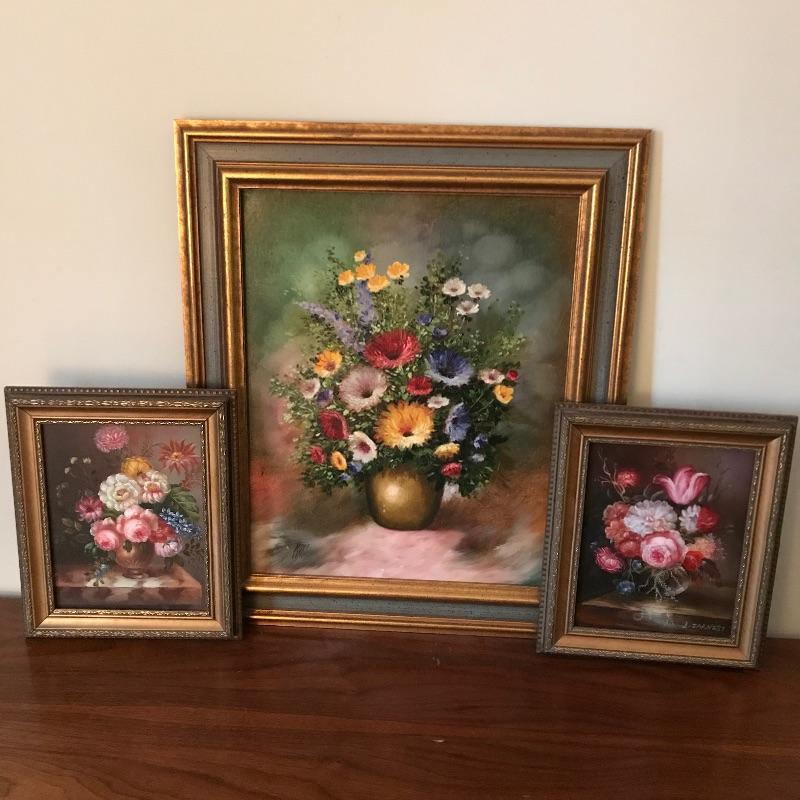 A trio of beautiful still life floral arrangements, signed and framed with painted wood. These beauties look great together, and yet would be stunning on their own as well. The two smaller ones have matching frames (11” x 13”) and complementing coloring. Signatures appear to be L. Earnest and W. Smith. The larger frame measures approximately 21” x 25.25” and has a Ross signature. All three appear to be original and either oil or acrylic paint. Come to the preview to see for yourself! Shipping available. Please call UPS with dimensions at 828-252-6930 for a shipping quote prior to bidding.