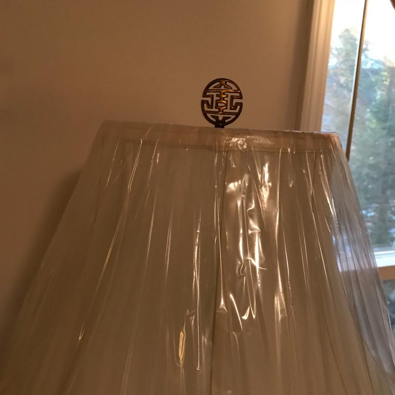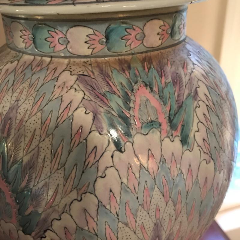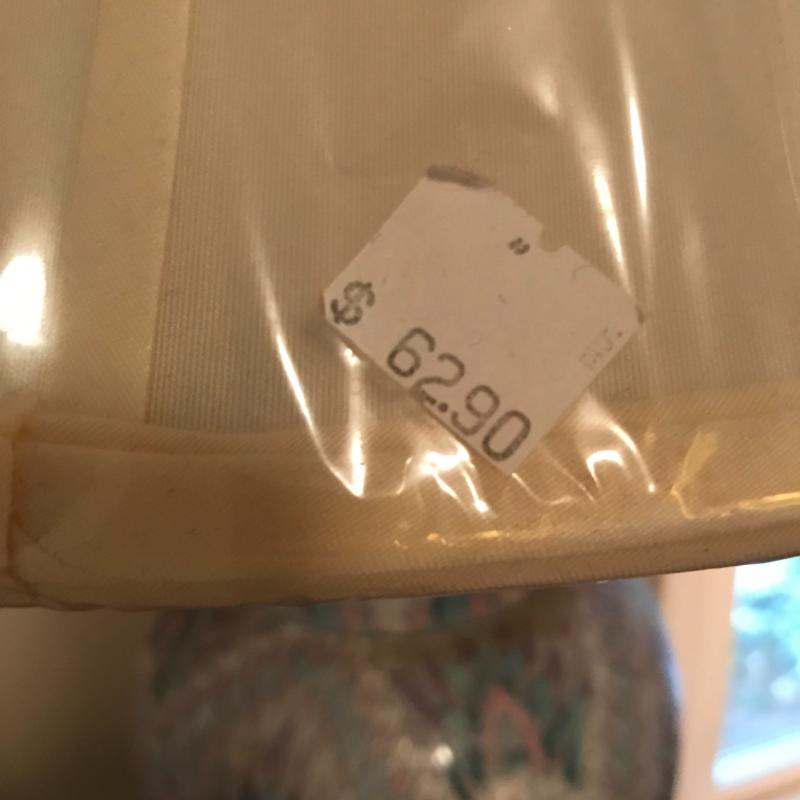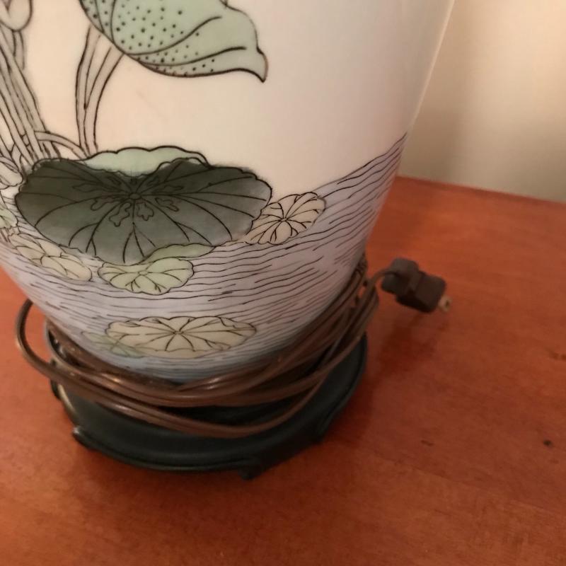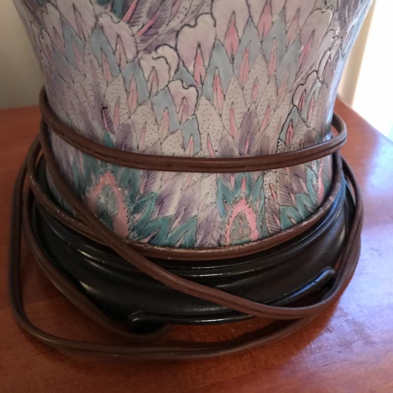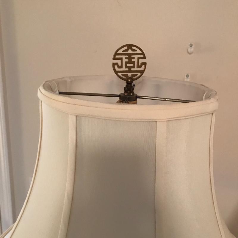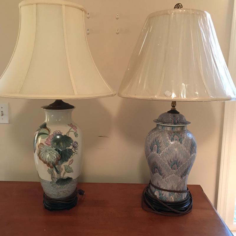 These gorgeous ceramic lamps are in great condition with new and like-new lampshades. Approx. 33” tall with 18” radius lampshades at widest point.