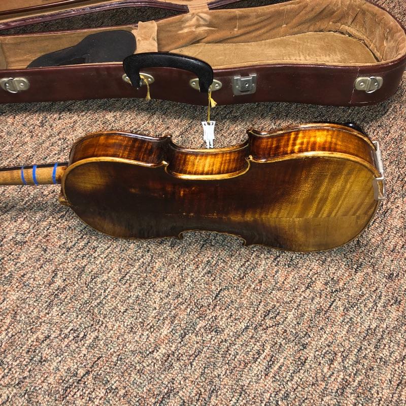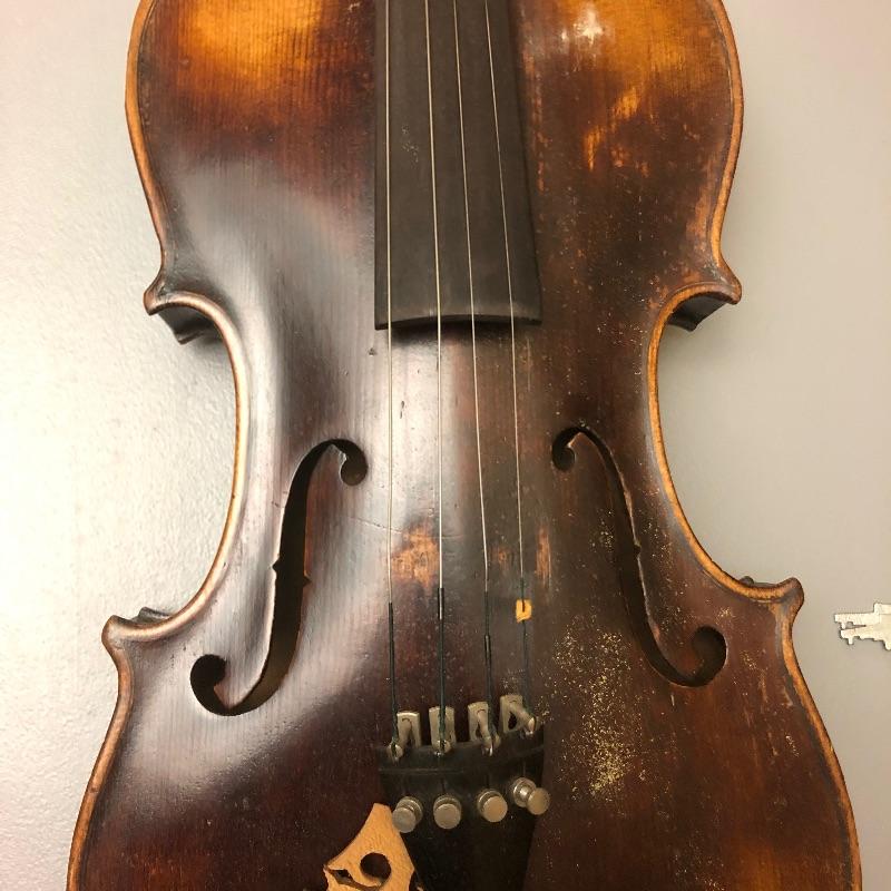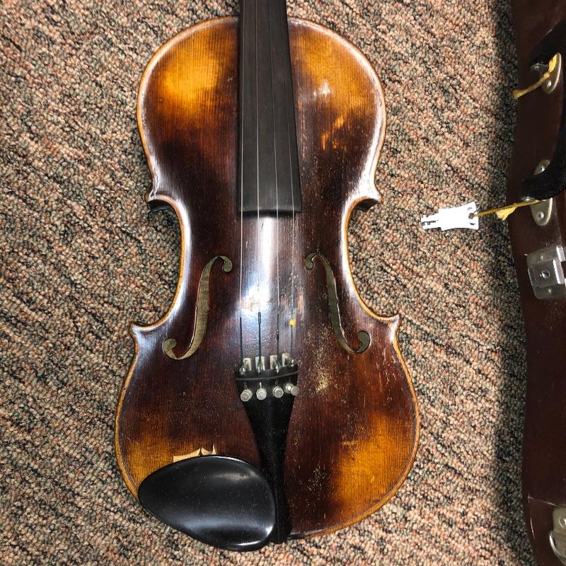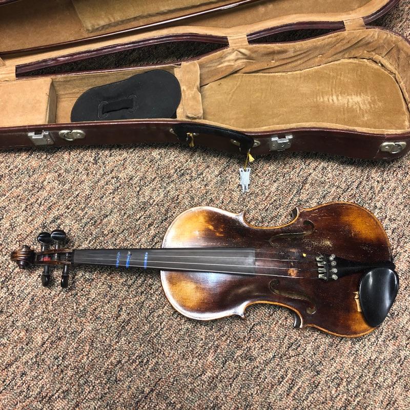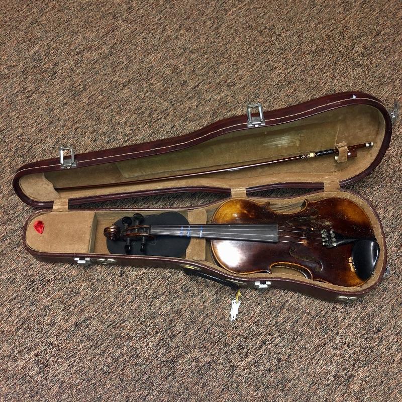 This lot includes a violin and it’s case. In the case are the bow and a cassette tape. The bridge on the violin has come loose. The bow has no hair. Violin case measures 31.5” in length. Owner claims the violin is German and over 100 years old. Shipping avaialable.