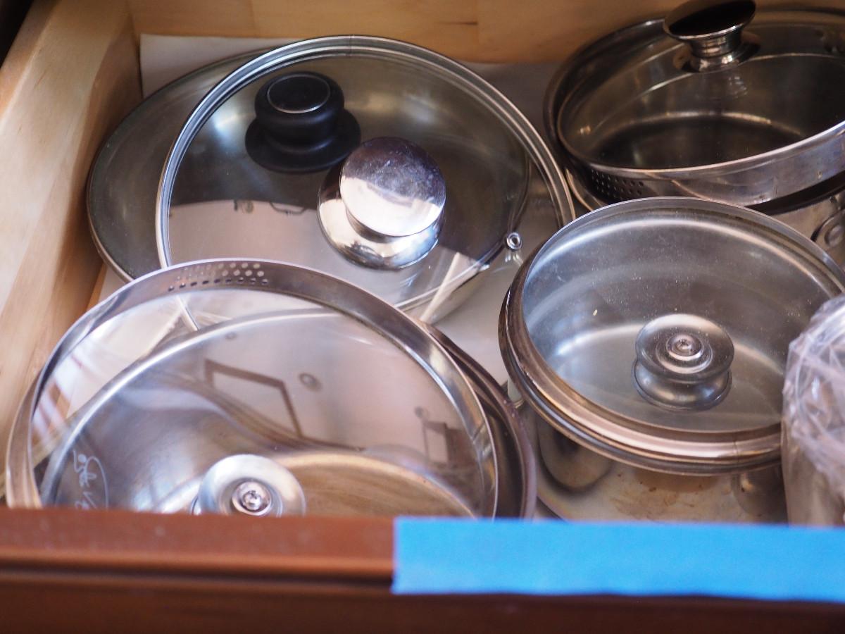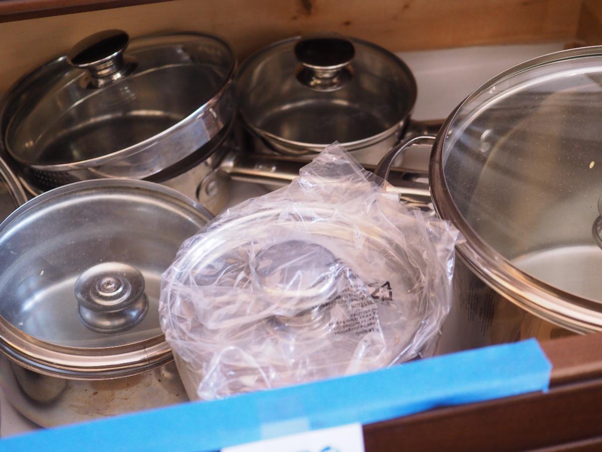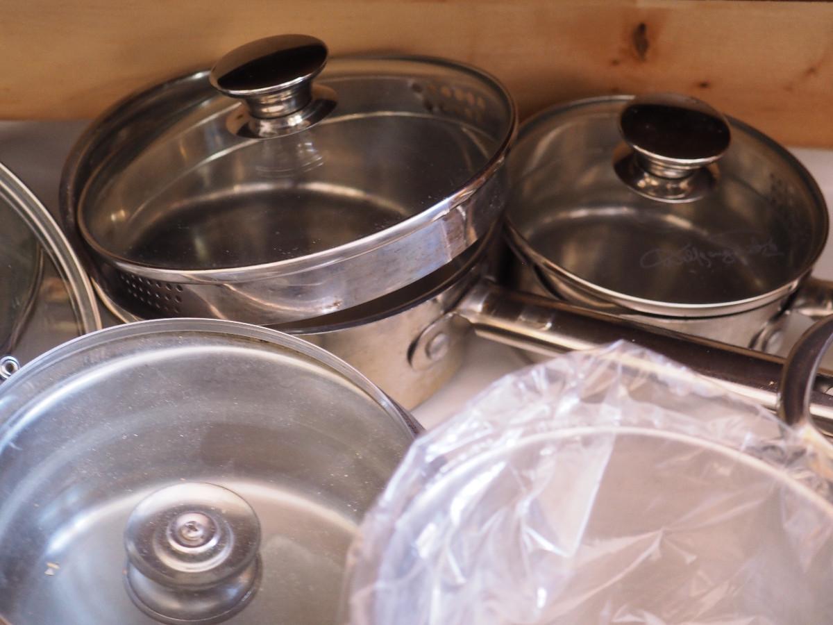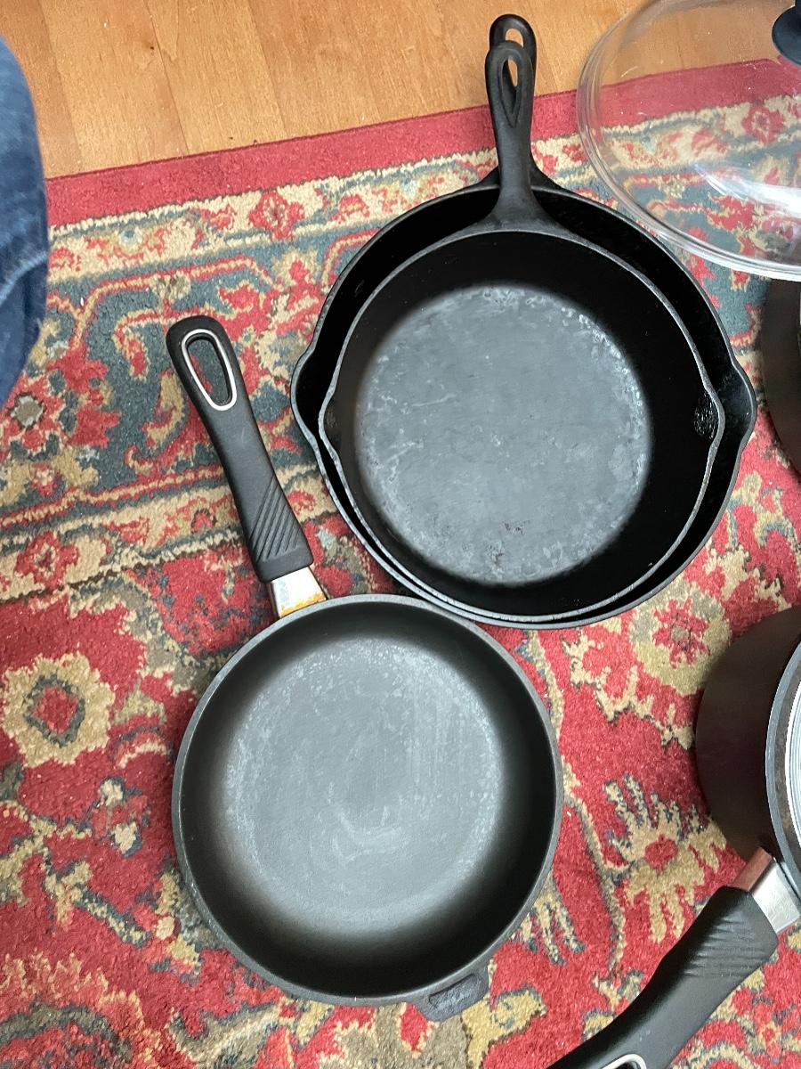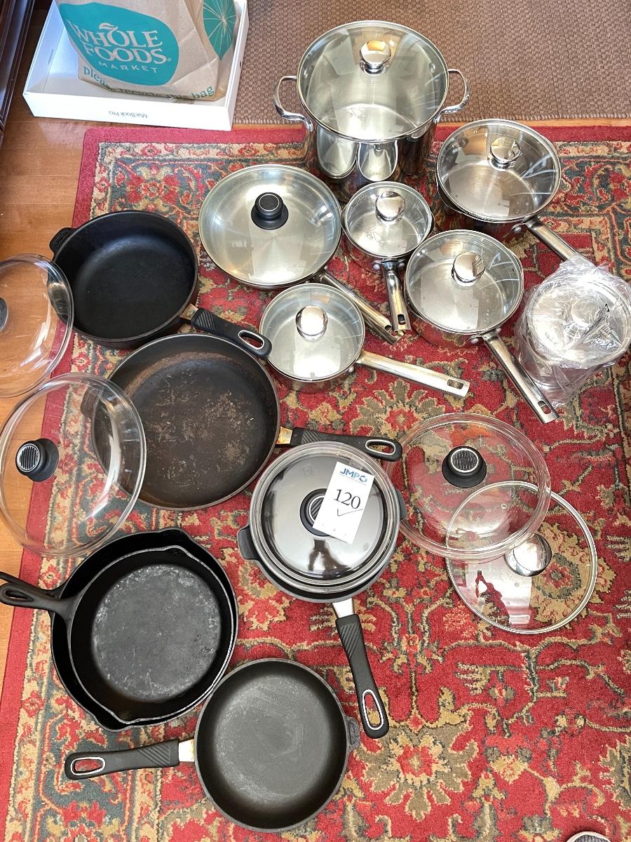 Stock pot and assorted cooking pots, cast Iron frying pans and other pots.