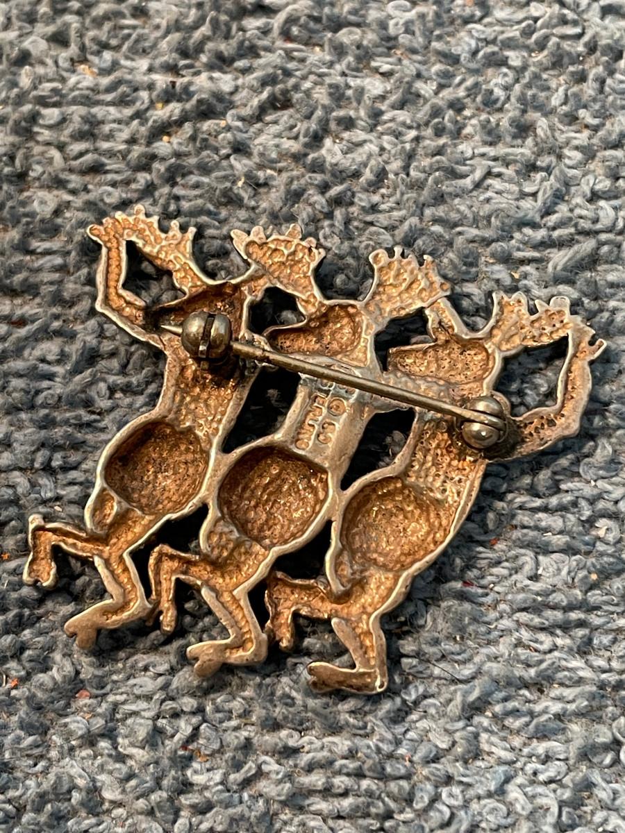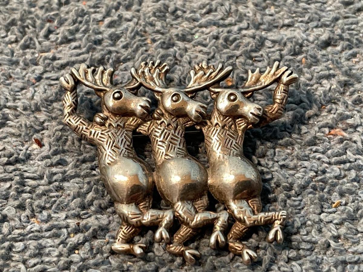 THIS IS A WONDERFUL COLLECTABLE CAROL FELLEY CHRISTMAS DANCING REINDEER PIN!!! MARKED.. 1 1/2'' WIDE.. 9.40GR TW.. LIGHT WEAR...