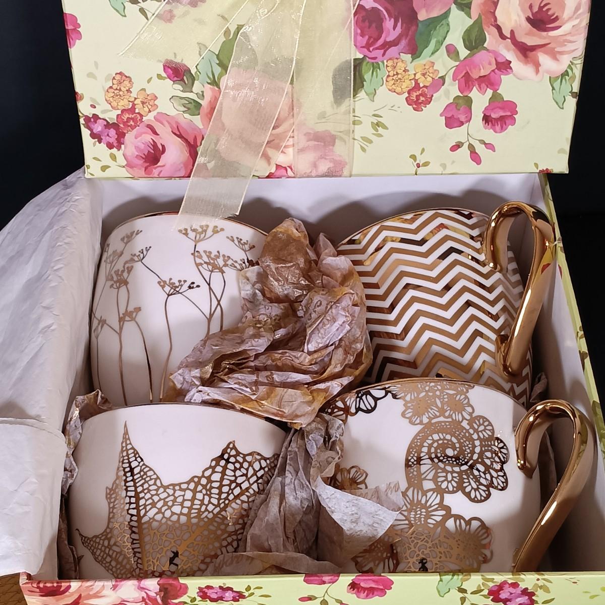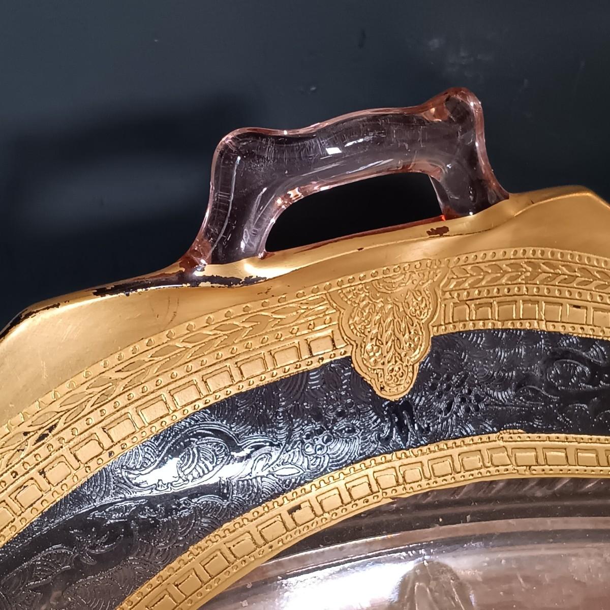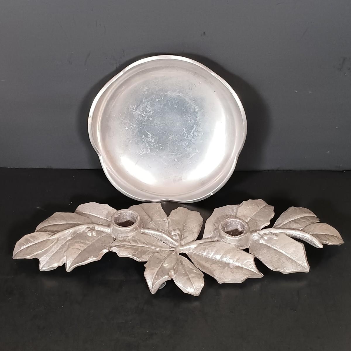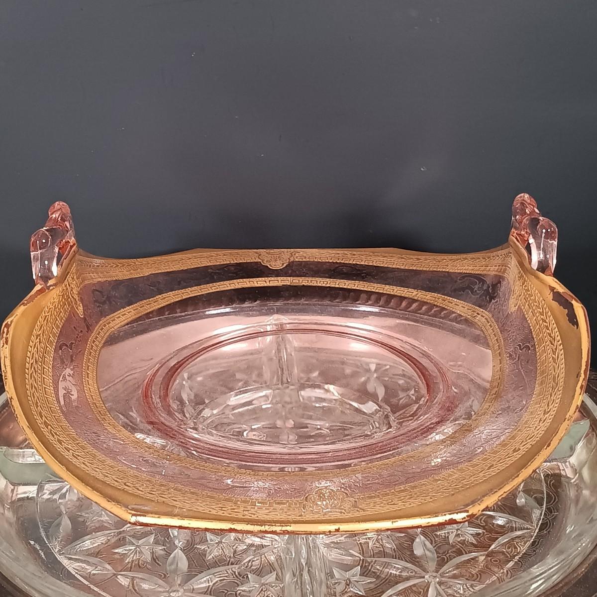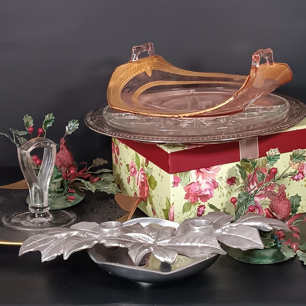 LOT 229: Gilded Pink Depression Glass Bowl, Studio Tu Mugs, Silver-Tone Metal Holly Candlestick Holder & More
