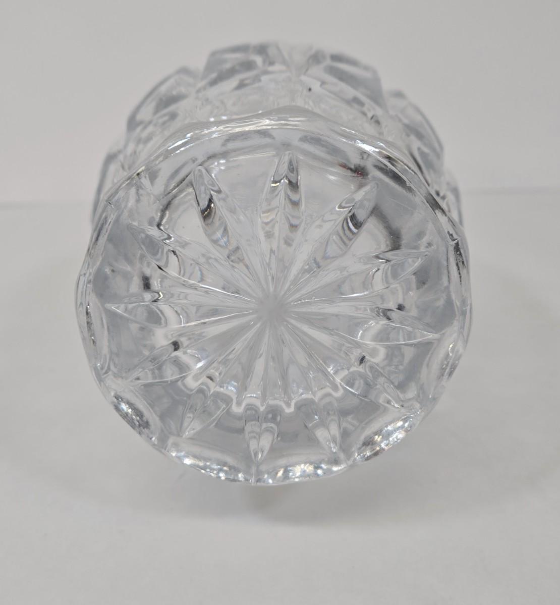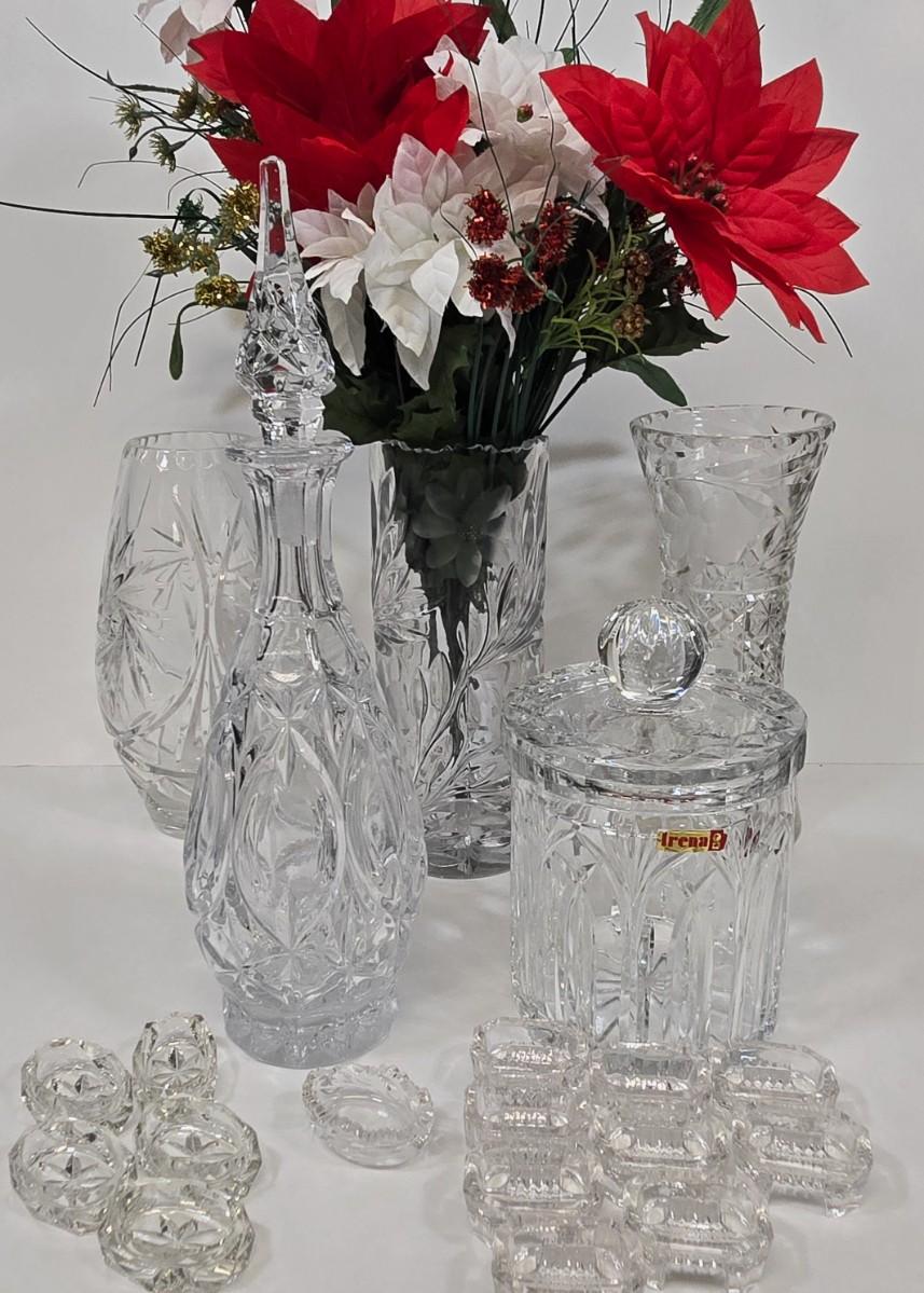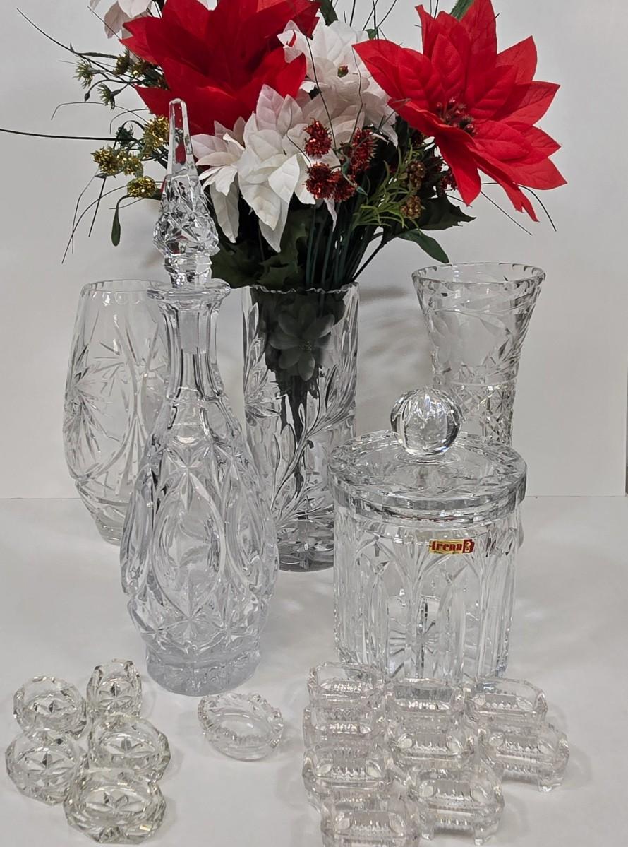 LOT 9: Vintage Handcut Irena Lead Crystal Biscuit Jar, Princess House Lead Crystal Wine Decanter, Salt Cellars, and 3 Crystal Vases