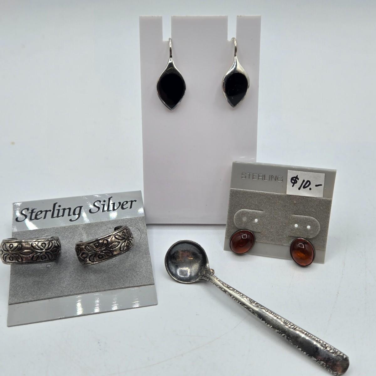 LOT 54: 3 Pairs of Sterling Silver Earrings/14.1 gtw and Sterling Silver Spoon Pin/5.7 gtw,