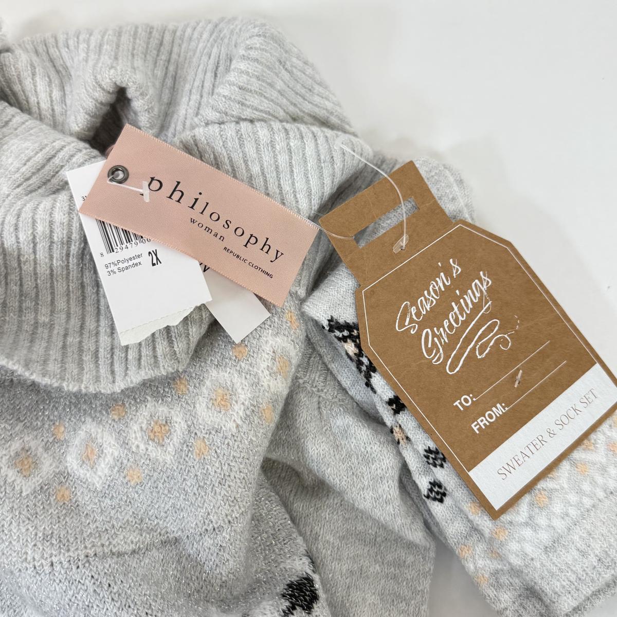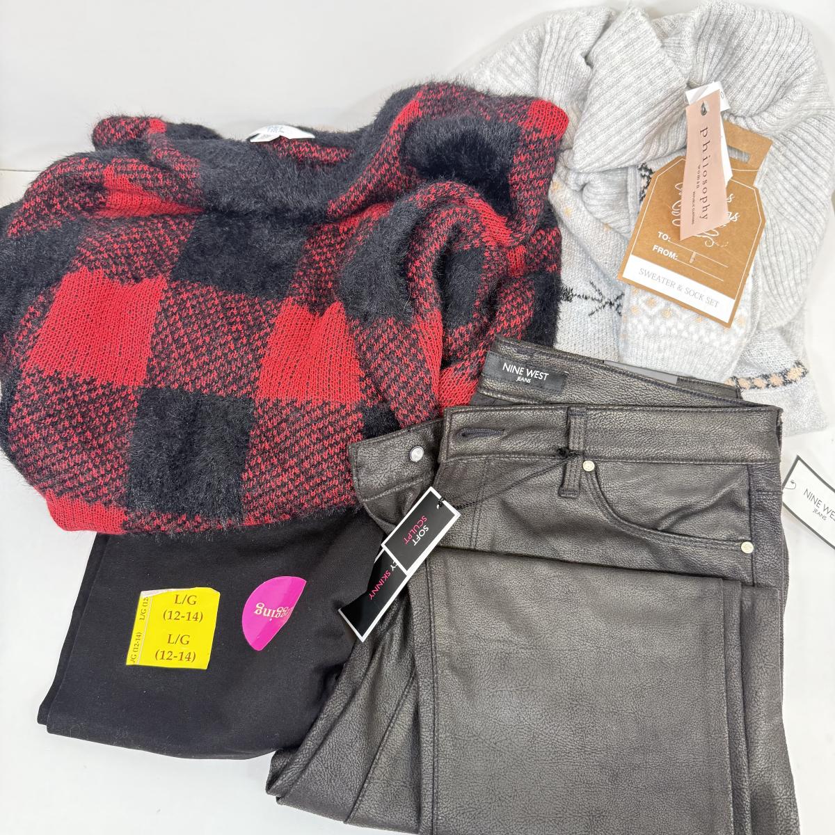 LOT 82: Women's Winter Outfits: Pair of 2XL Sweaters, Size Large Black Leggings & Nine West Pants (size 12)