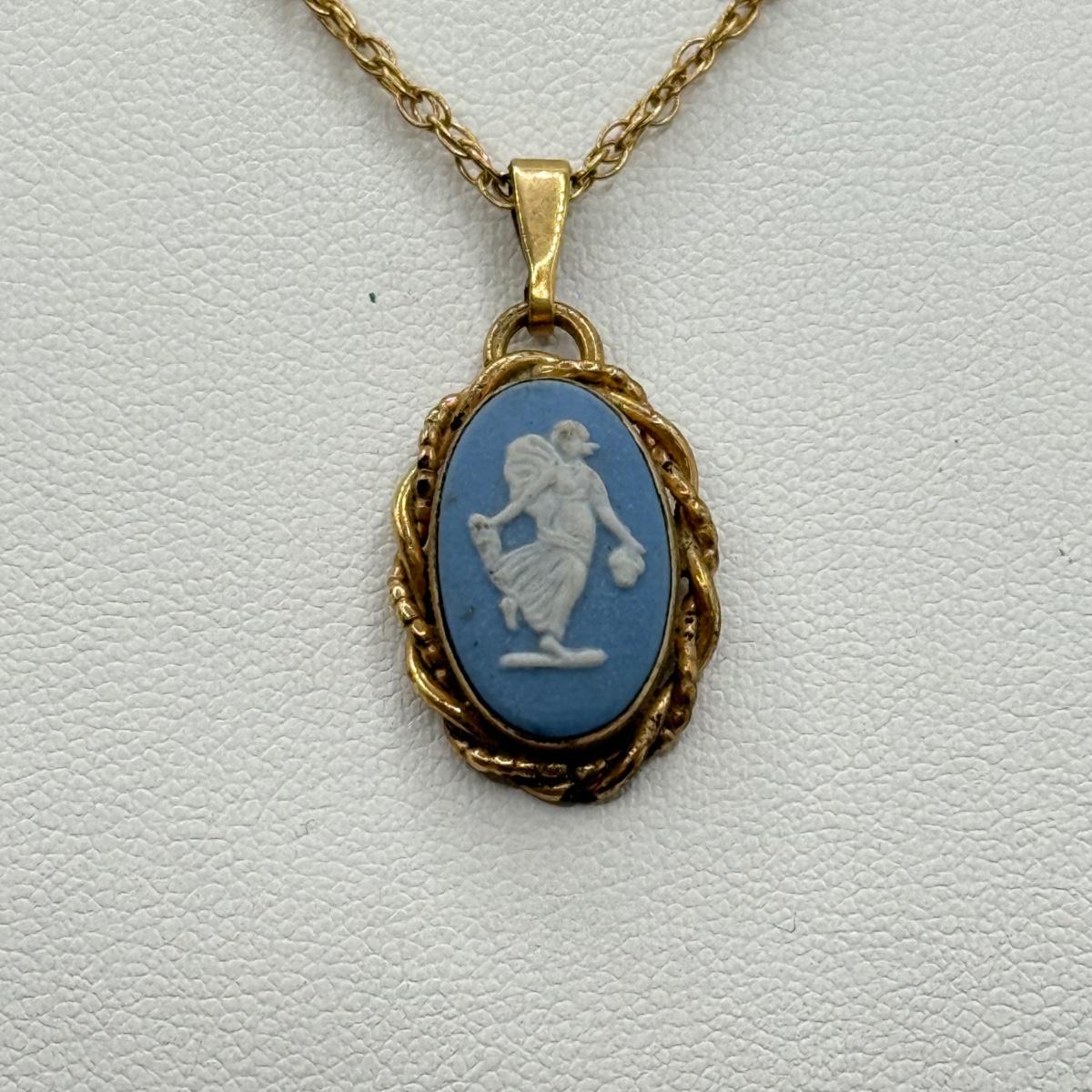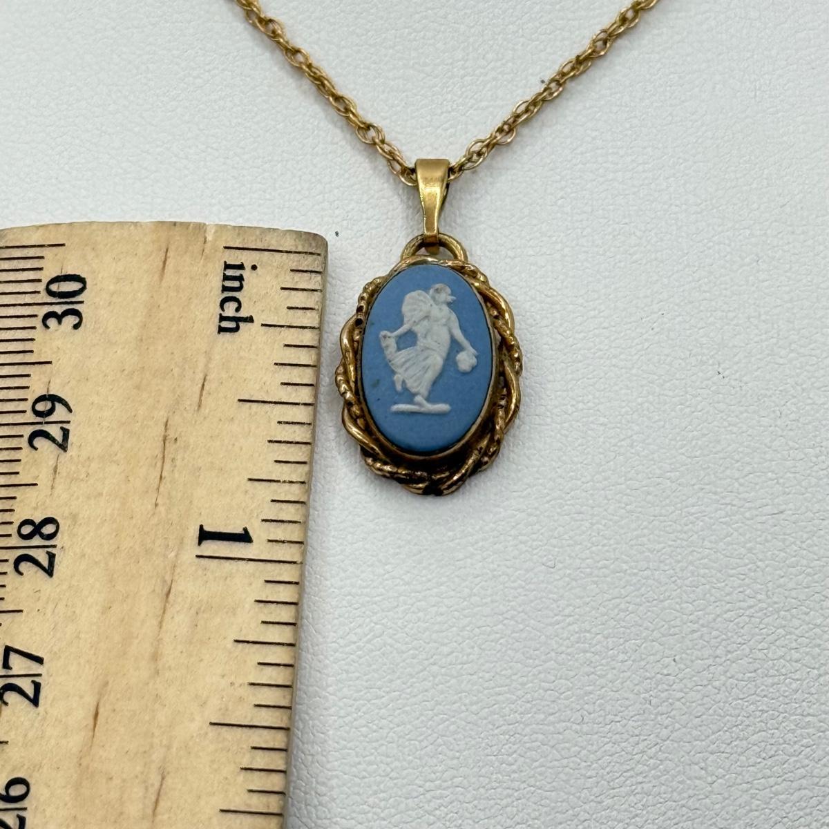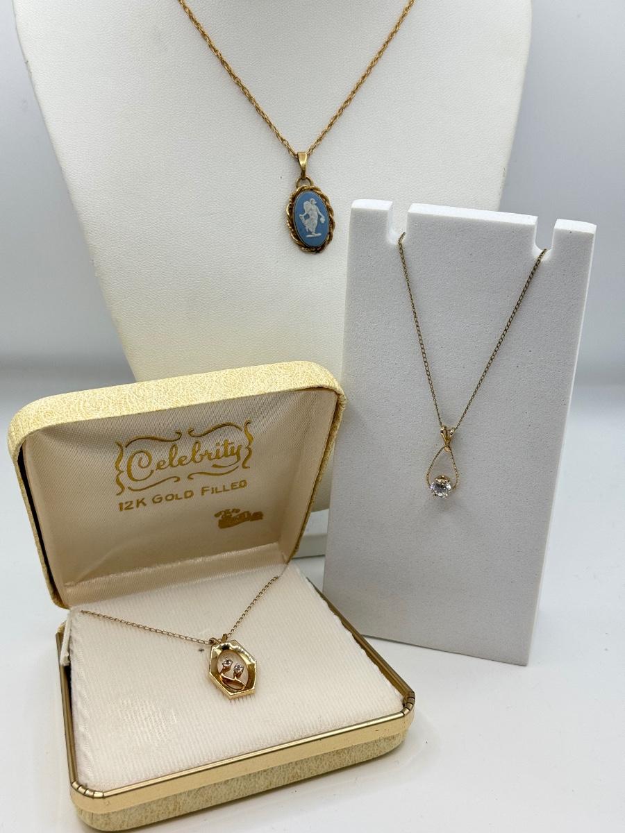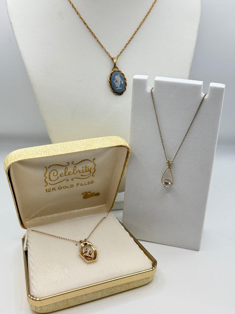 LOT 98: Wedgewood Necklace, 12k Gold Filled Celebrity Necklace in Box & Another Gold Fill Necklace (18”, 18”, 16”)