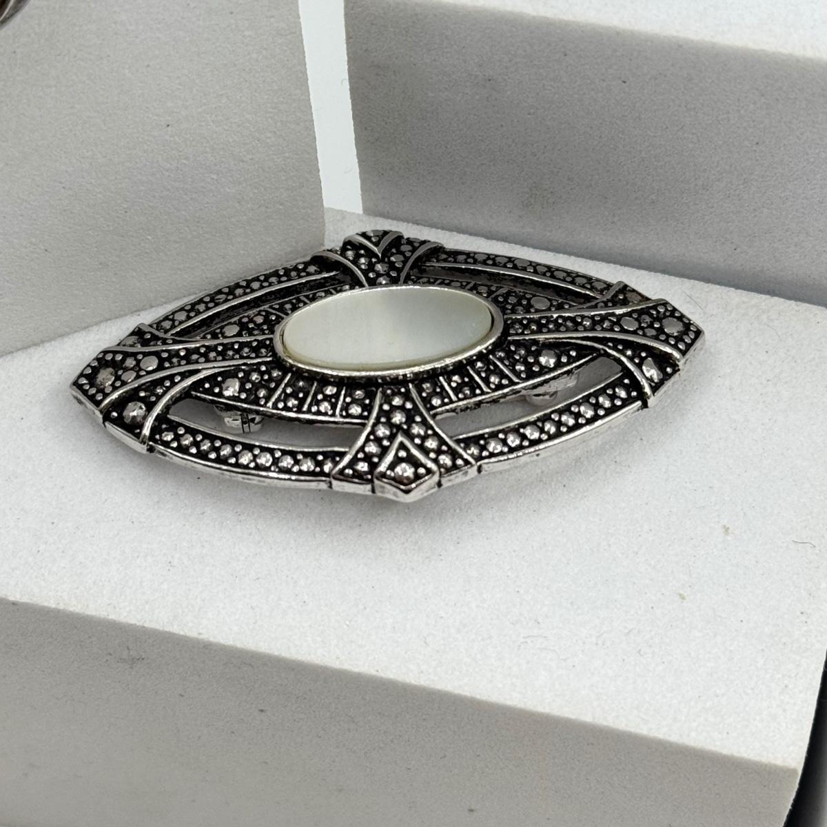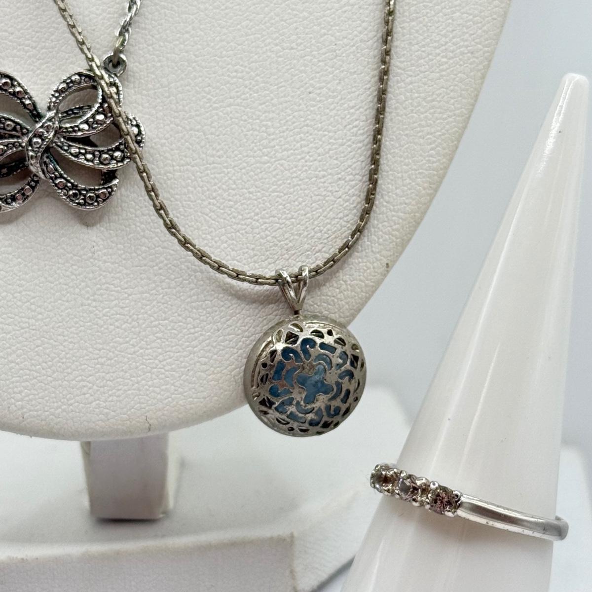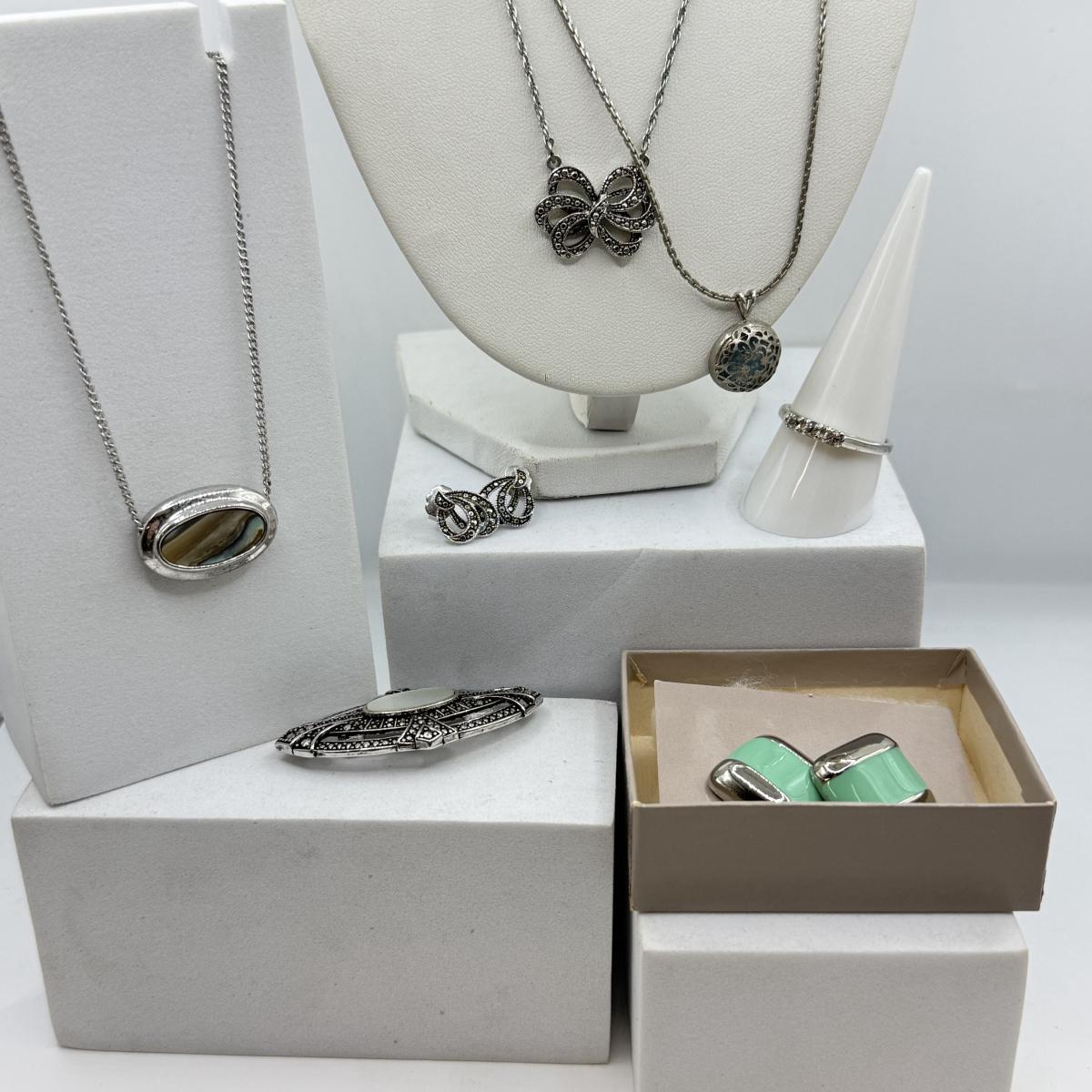 LOT 105: Avon Sterling and Glass Ring (sz 9), Avon Earrings in Box, Faux Marcasite Pieces & More