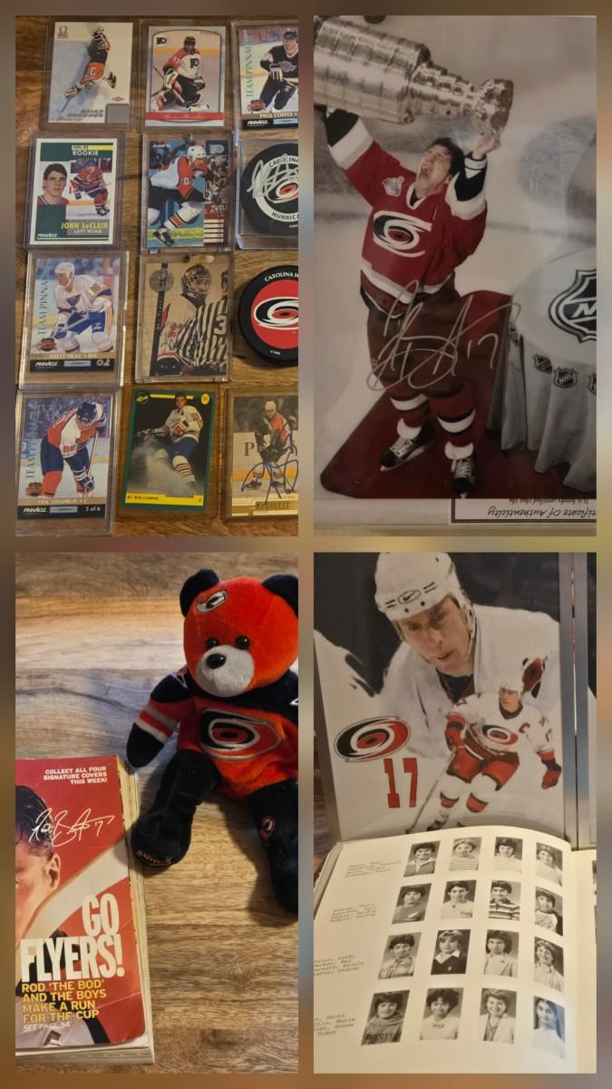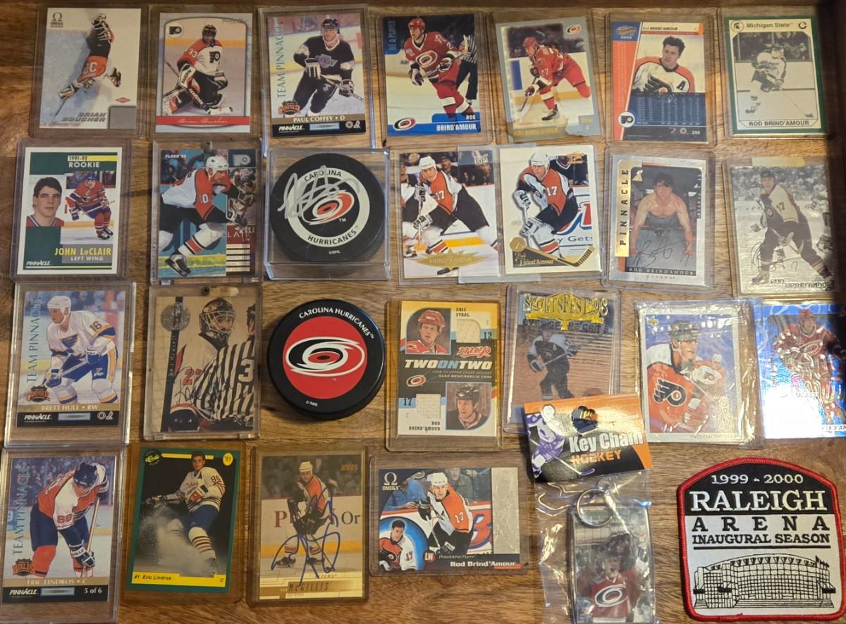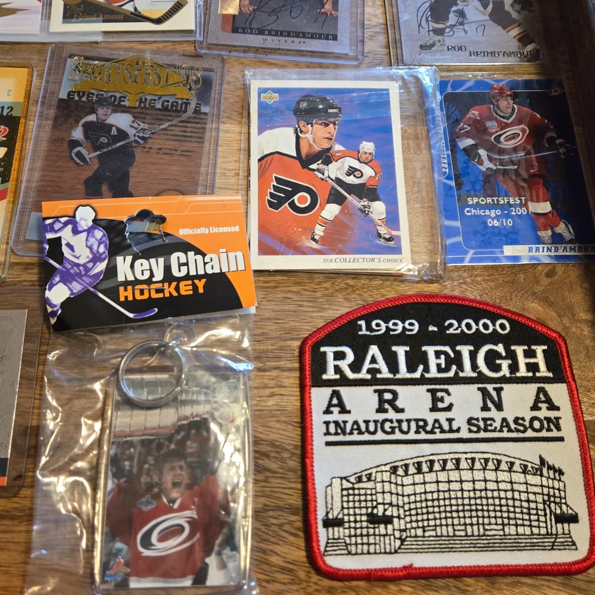 LOT 157: Hockey Cards Featuring Lindros, LeClair, Boucher, and More/ Rod Brind'Amour Autographed Photo with COA, Cards, Bobble Head, Signed Puck, Yearbook, and More