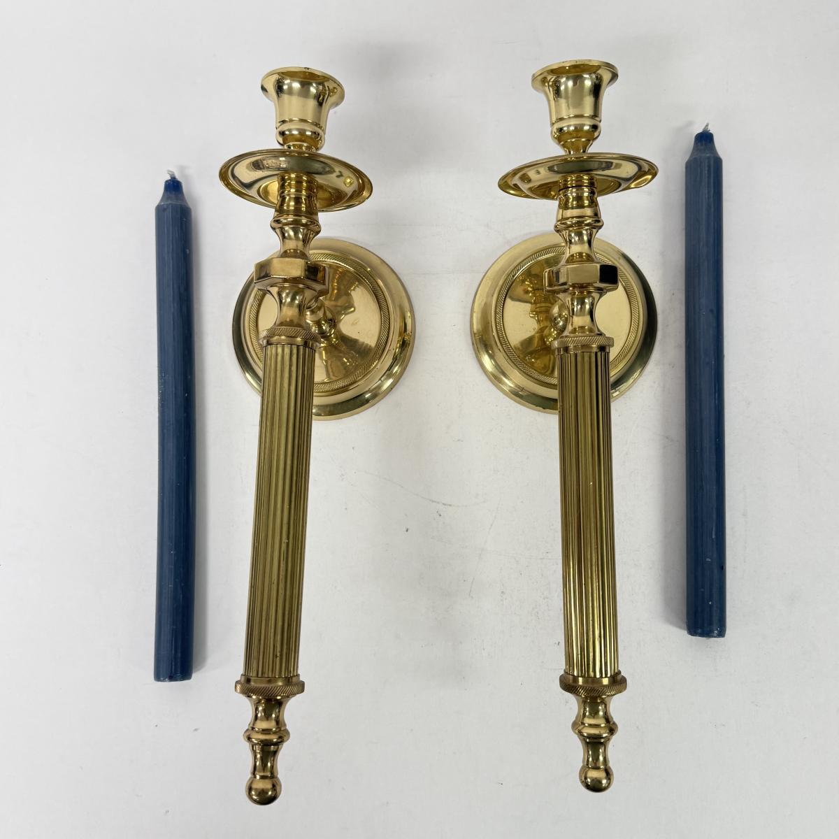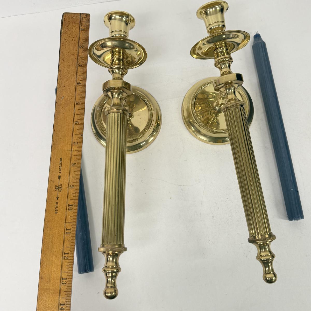 LOT 192: Pair of Wall-Mounted Brass Candlestick Holders made in India w/ Blue Candlesticks