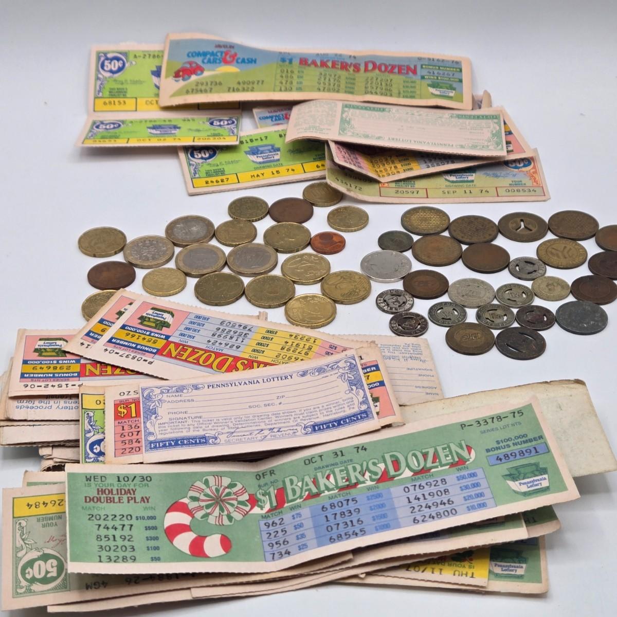 LOT 26J: Vintage Lottery Tickets, Collection of Euro Coins, and Philadelphia Transit Tokens