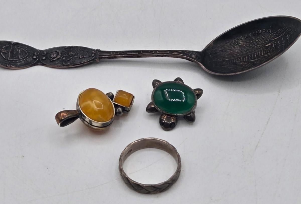LOT 29J: Vintage Sterling Silver Turtle Pin, Pendant 13.35 gtw, and Silver Spoon 13.68 gtw