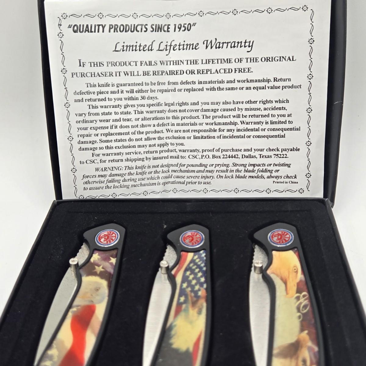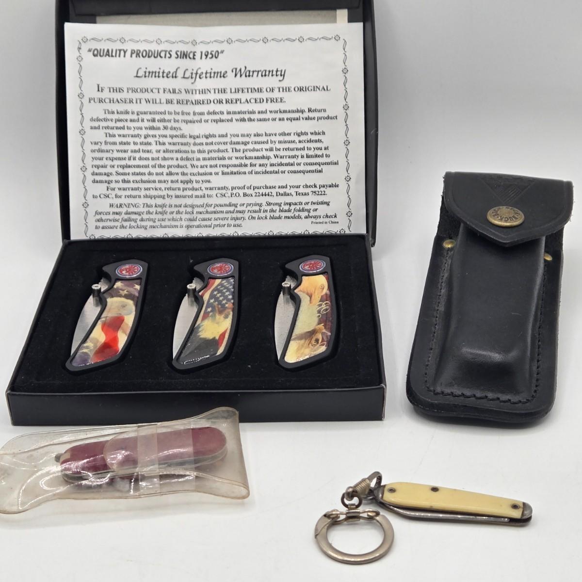 LOT 31J: NIB 3 Pocket Knives with Eagle Design, Buck Knife with Case, and More