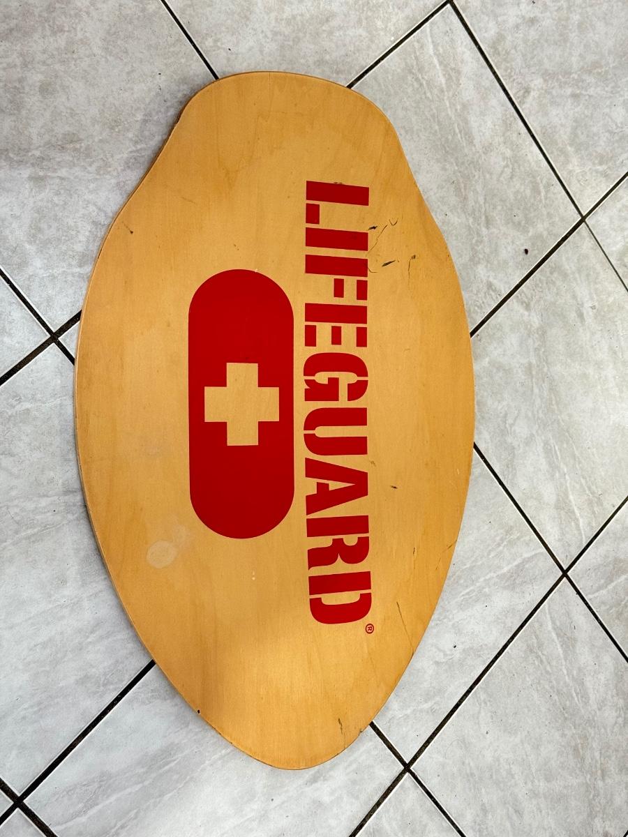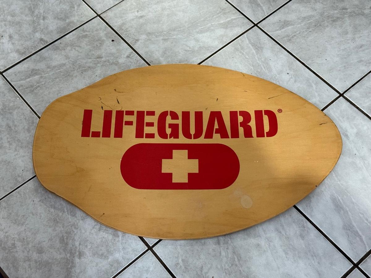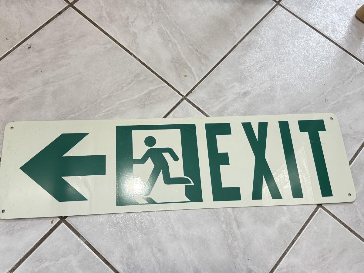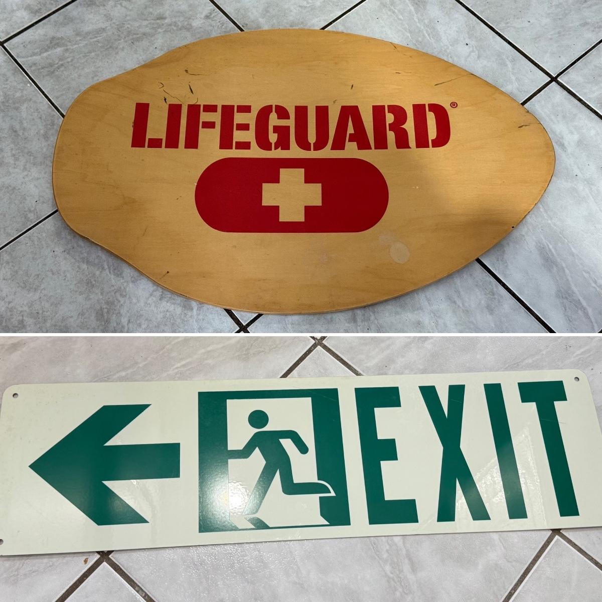 LOT 77: 25 x 7 Green Metal Exit Sign & Wood Lifeguard Wall Decor