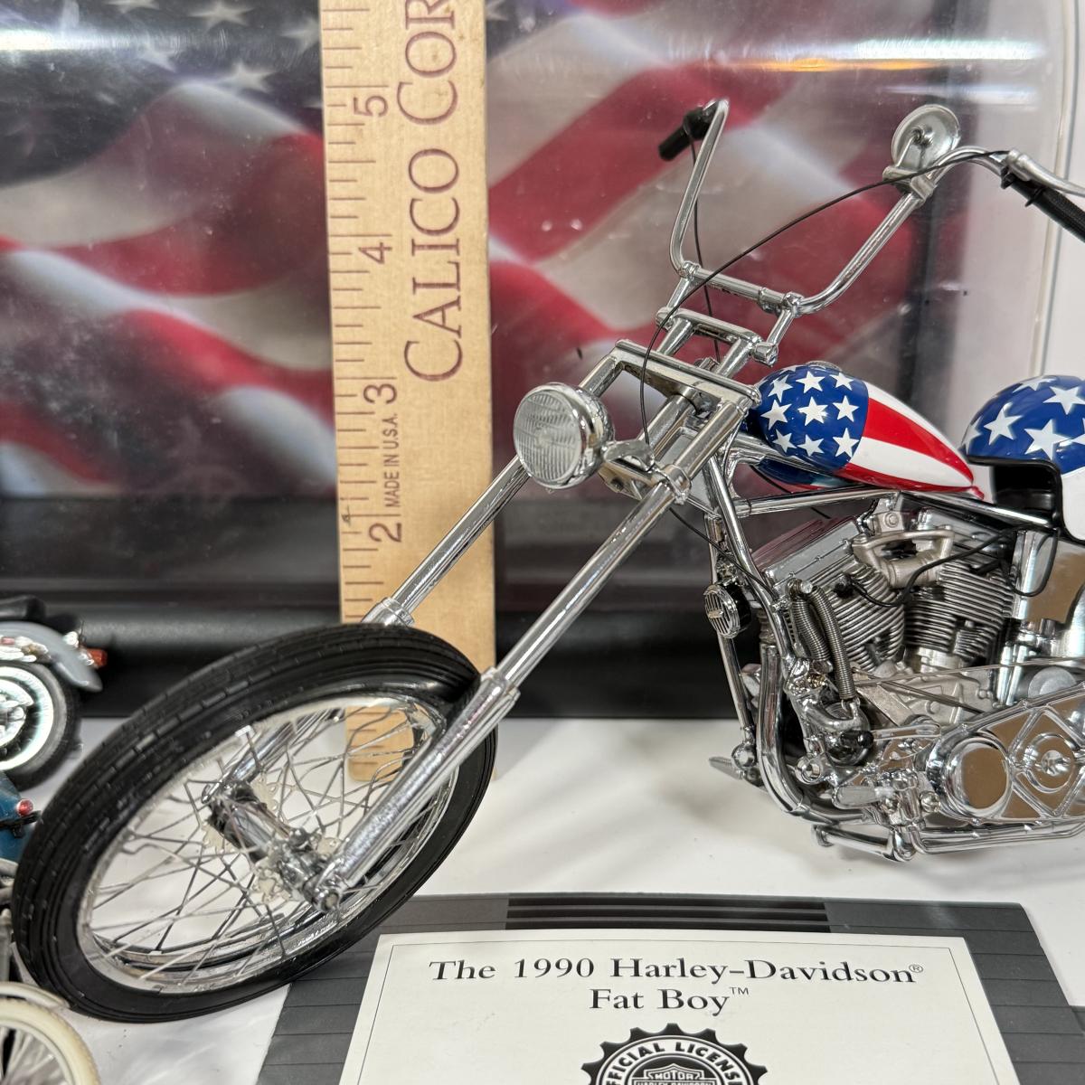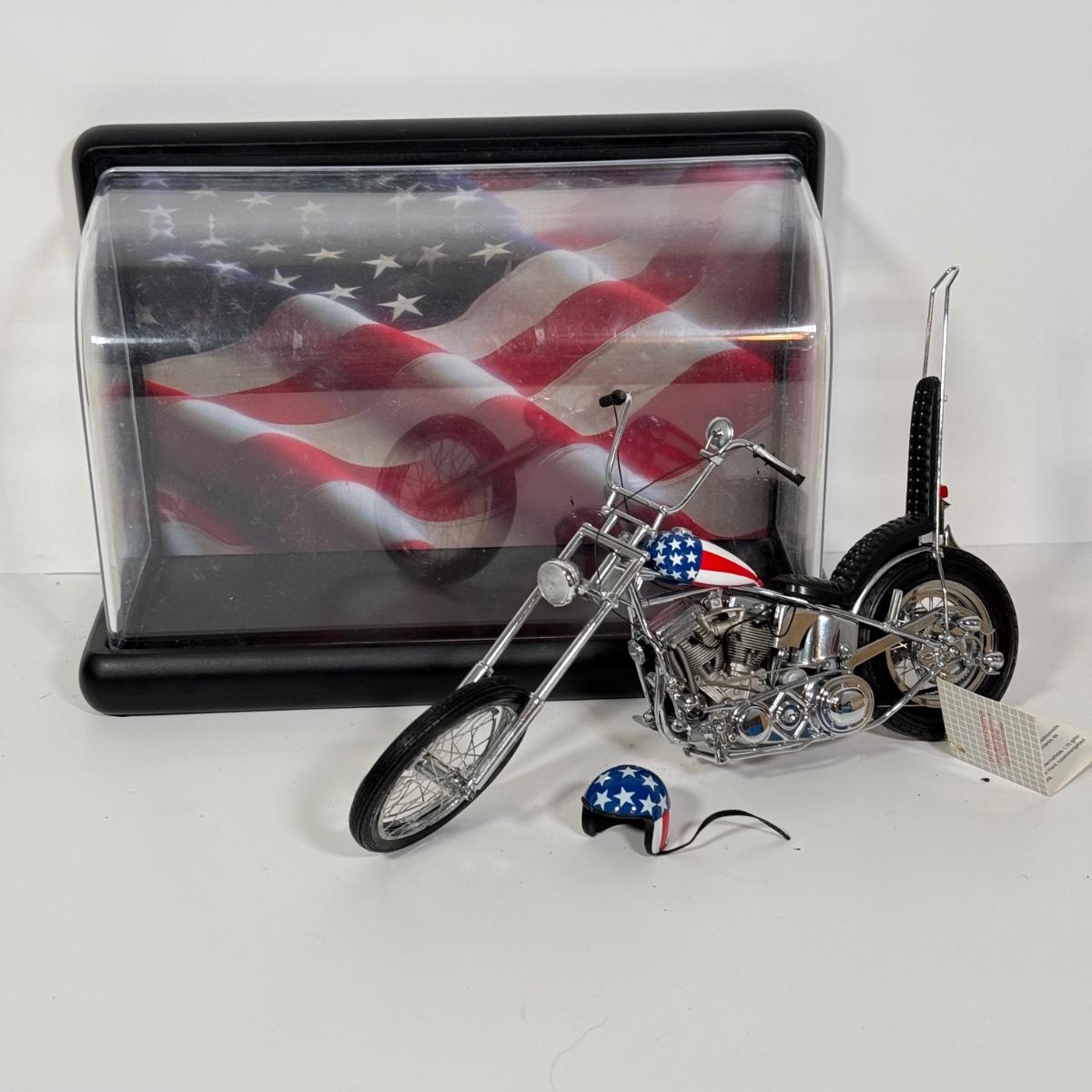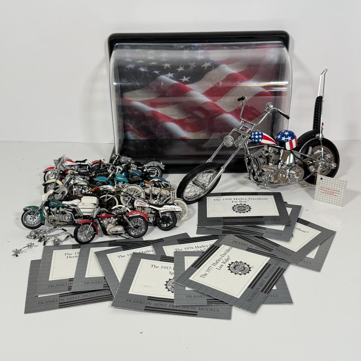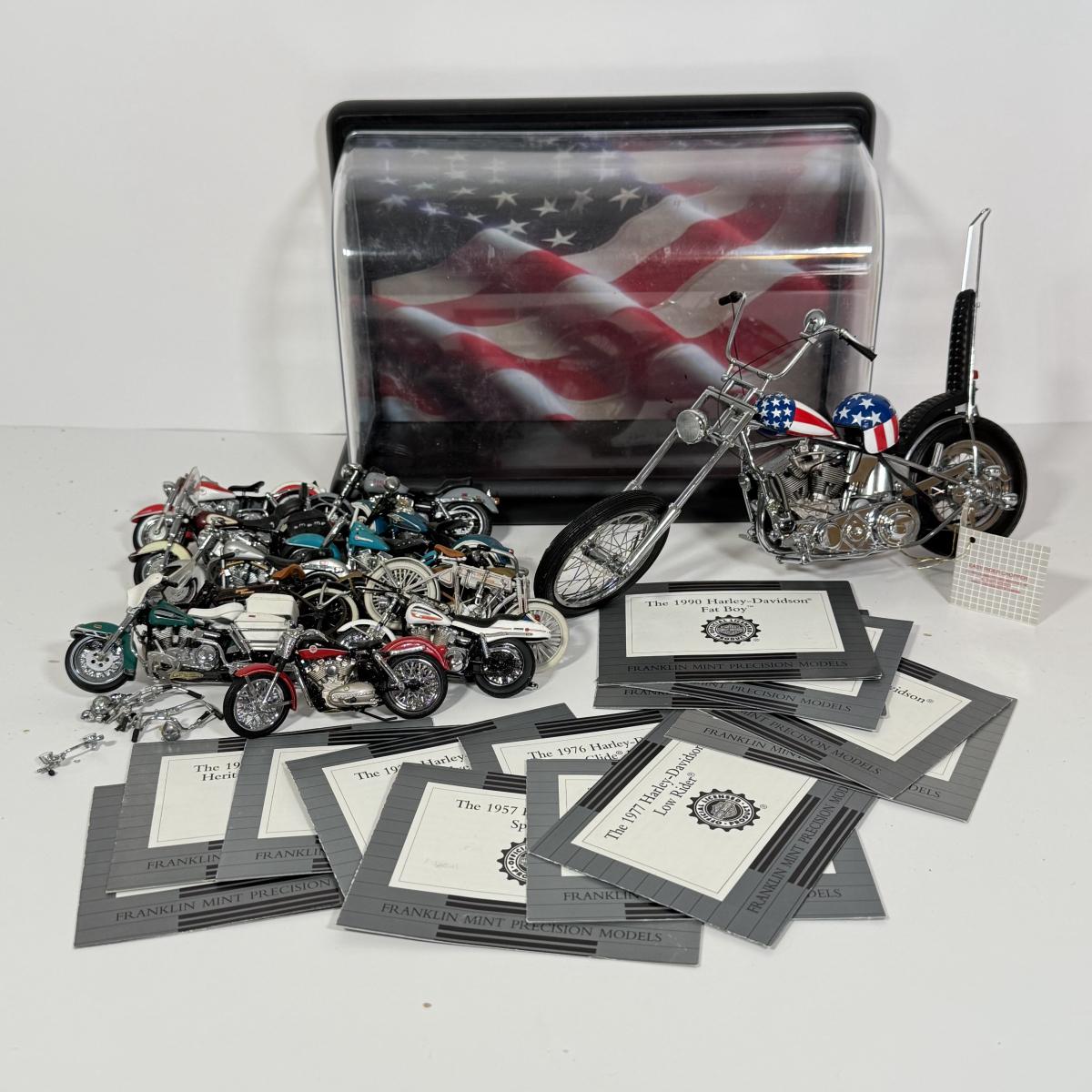 LOT 81: The Franklin Mint Motorcycle Models w/ COAs & American Flag Motorcycle Model w/ Helmet & Display Case