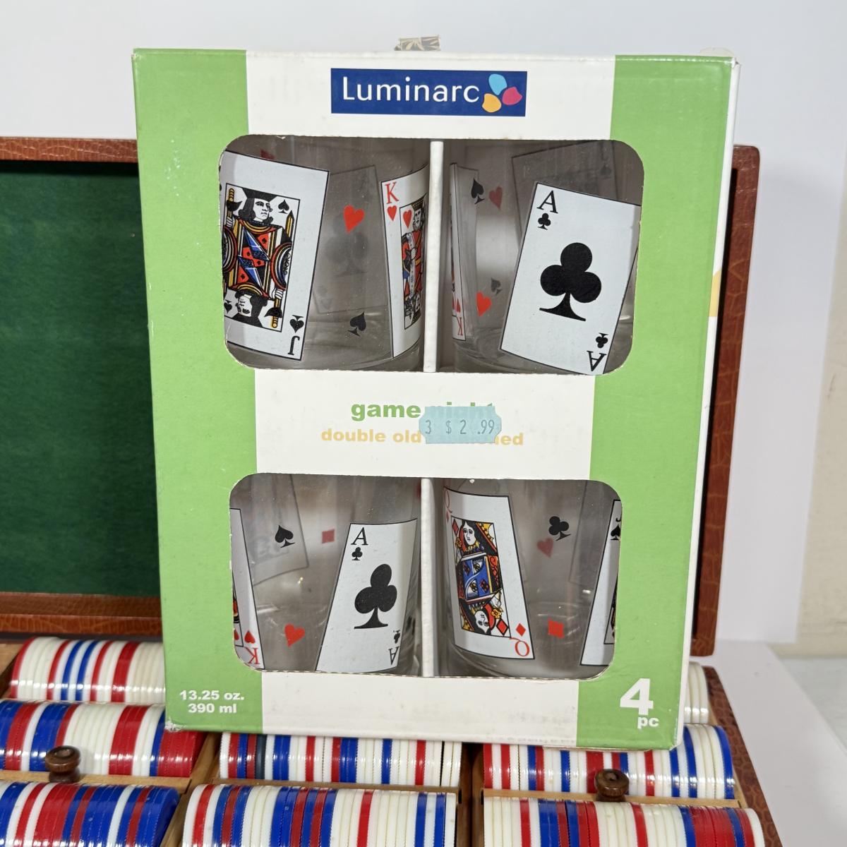 LOT 91: Three Luminarc NIB Card Party Glass Sets & Set of Poker Chips in Case