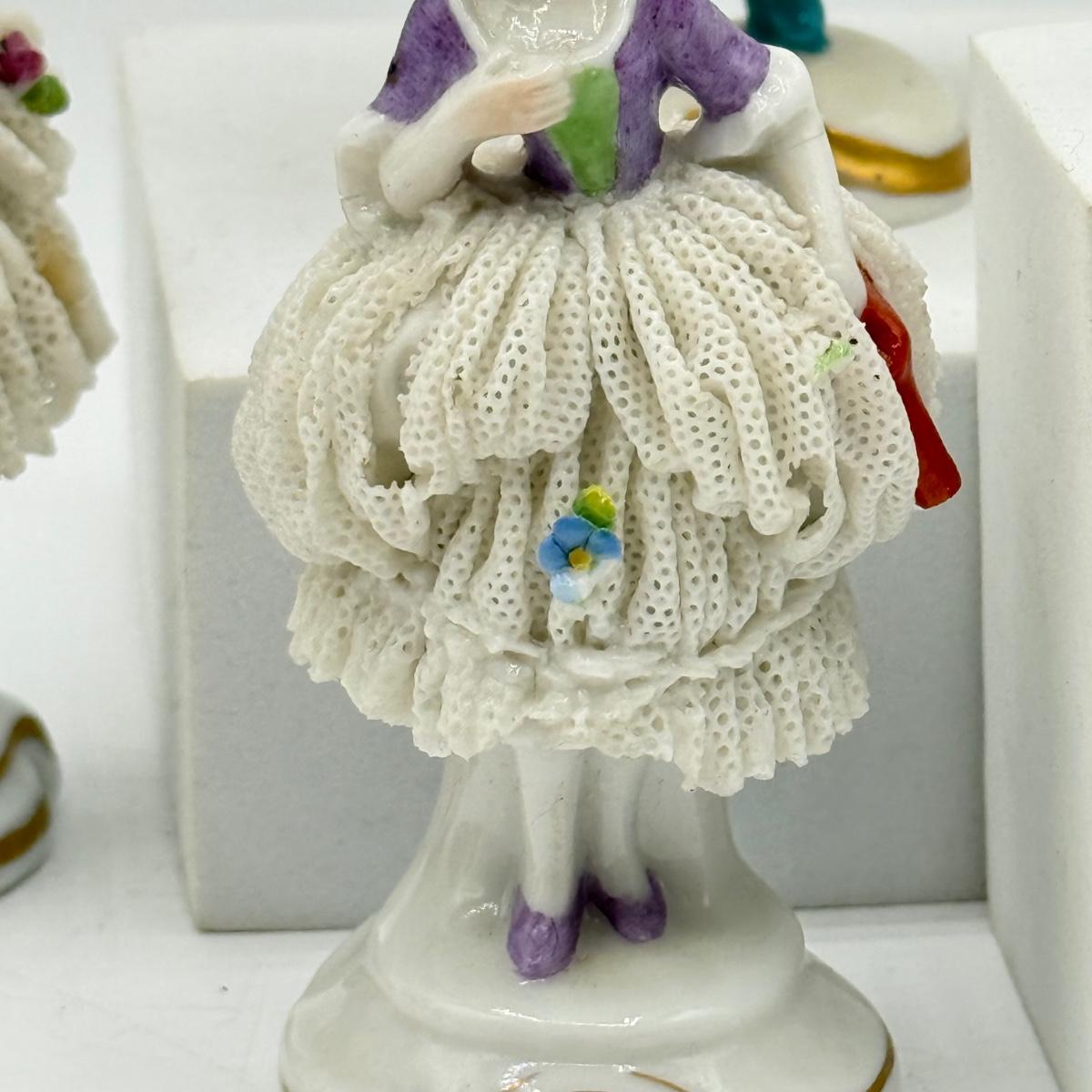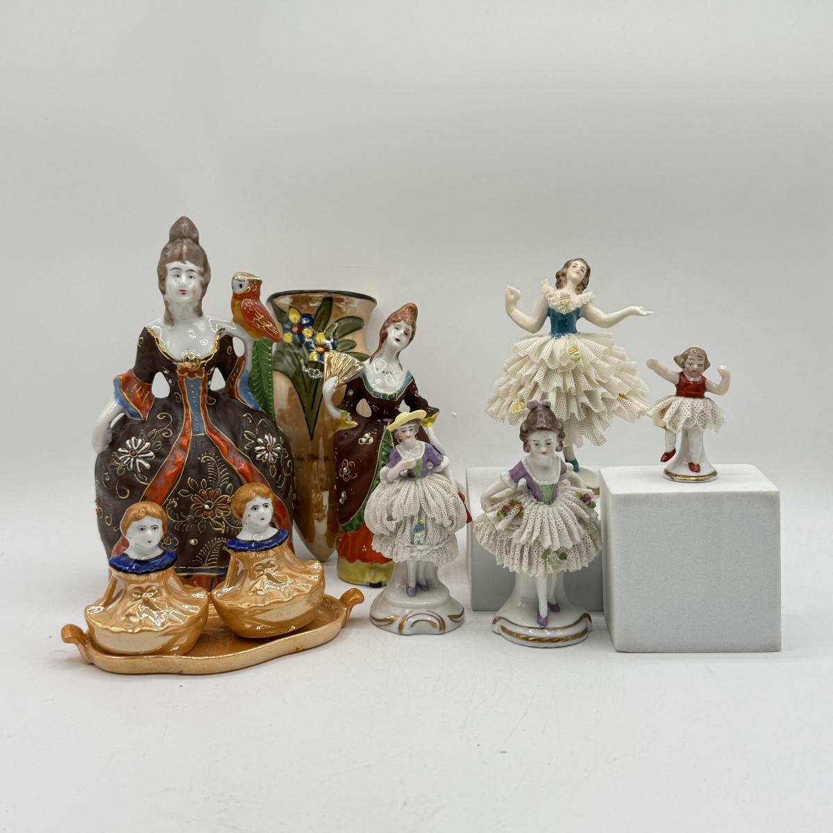 LOT 100: Dresden Doll Style Porcelain Figures, Wall Mounted Victorian Lady w/ Bird & More