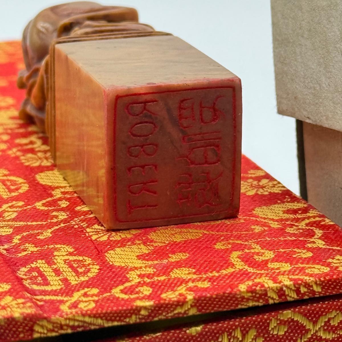 LOT 104: Dragon Topped "Robert" Stamp Set, Dharma Matchbook & Three Japanese Kokeshi Wooden Dolls