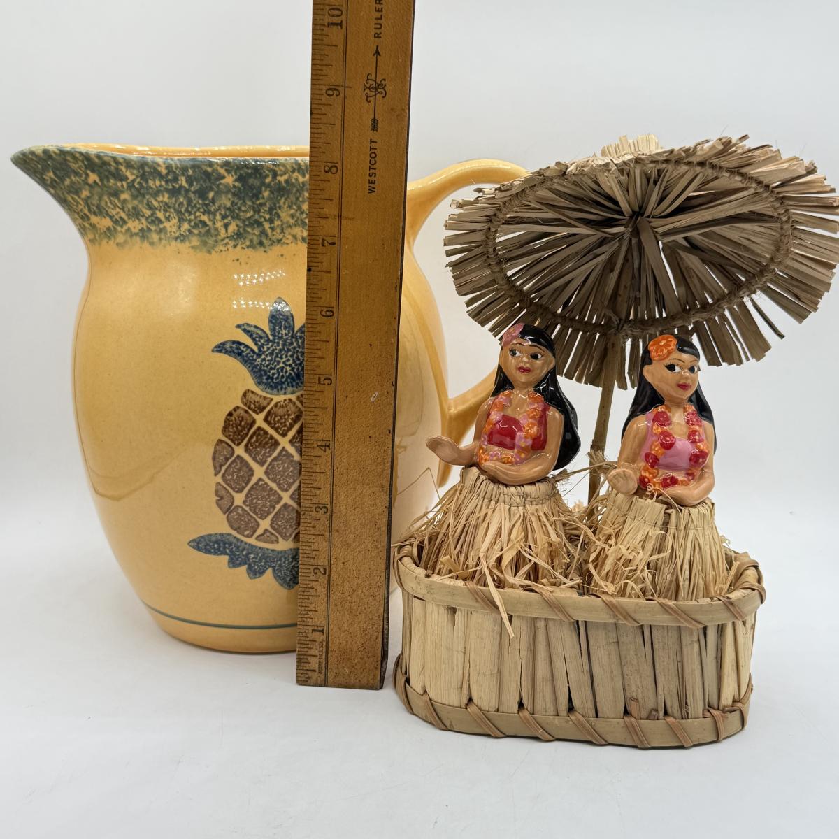 LOT 107: Pfaltzgraff Pineapple "Friendship" Pitcher & Hula Girl S&P Shakers