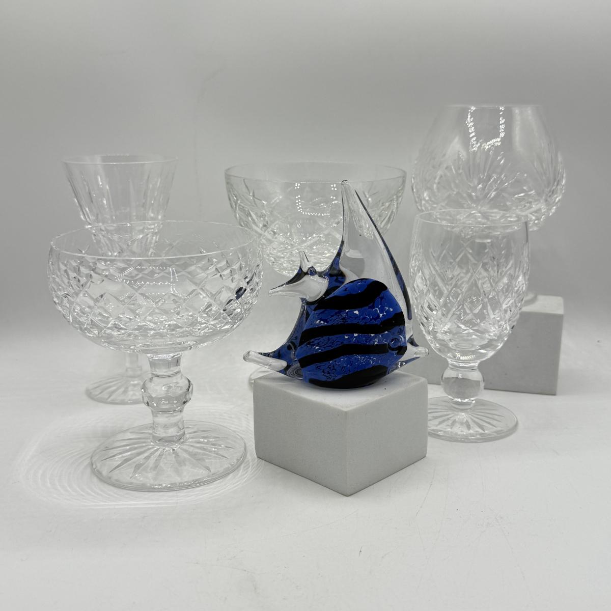 LOT 109: Hand Blown Glass Fish Paperweight w/ Waterford & More Stemmed Crystal Glasses