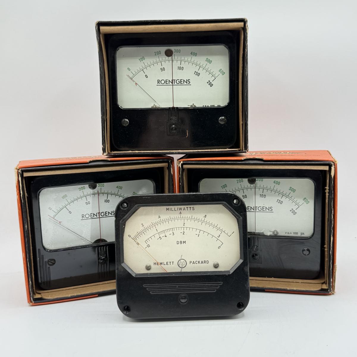 LOT 111: Vintage Simpson Roentgens Panel Meters w/ Boxes & Vintage Hewlett Packard DBM Milliwatts Panel Meter